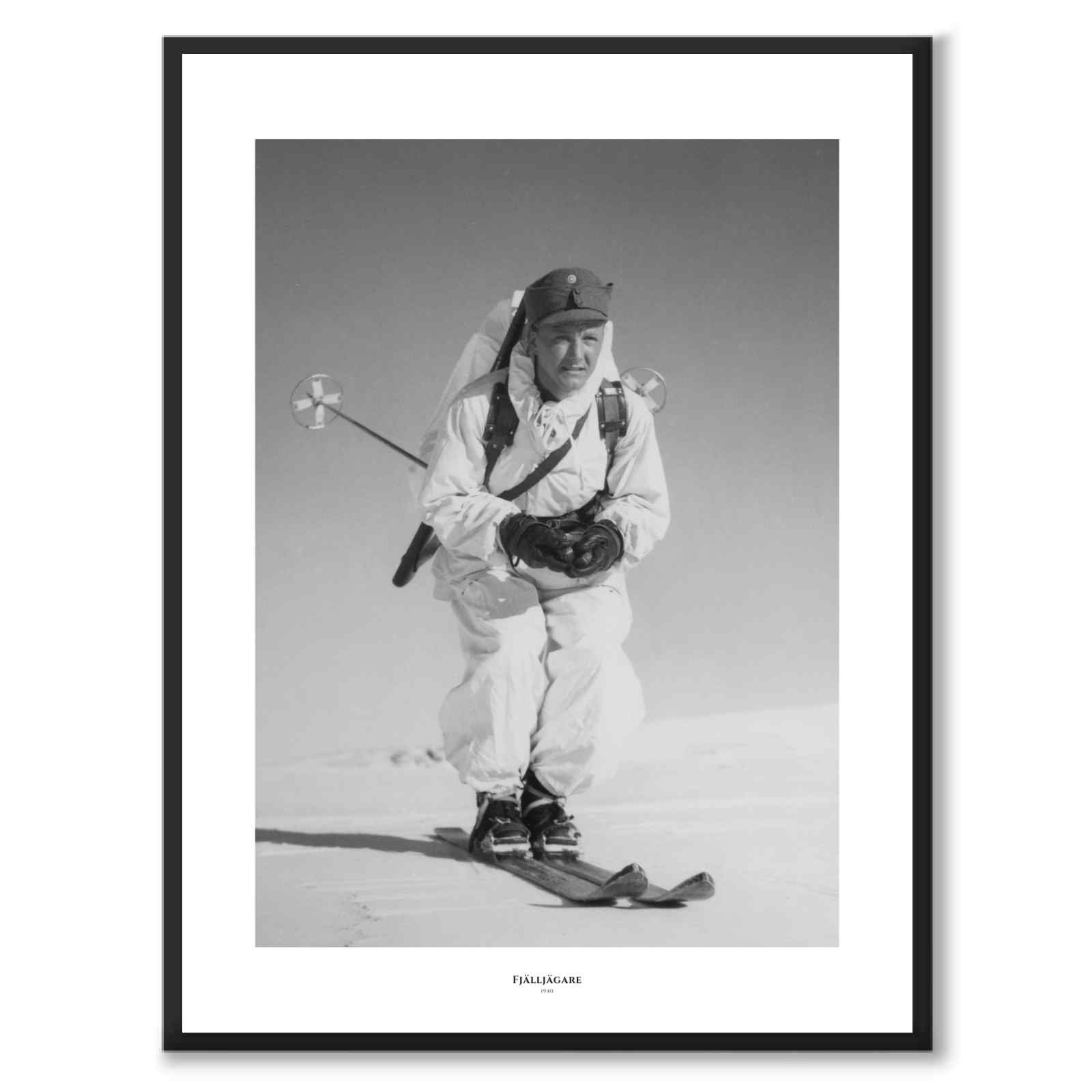 Poster med ett fotografi taget under andra världskriget 1940. På fotot ser vi en svensk soldat som åker skidor i ett vinterlandskap. Soldaten har på sig en snödräkt och är beväpnad.