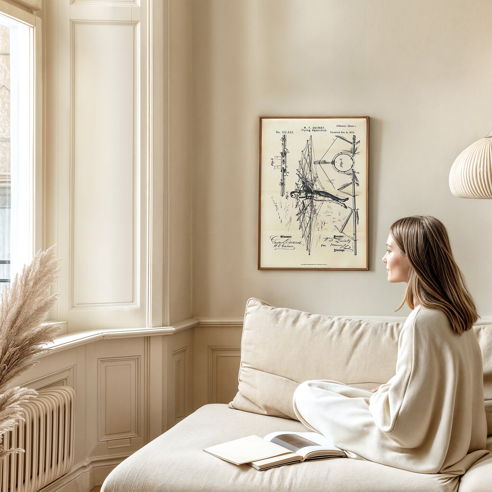 Poster med en patentritning från den 8 oktober 1872 för en "Flying Apparatus" (flygapparat) designad av W.F. Quinby.