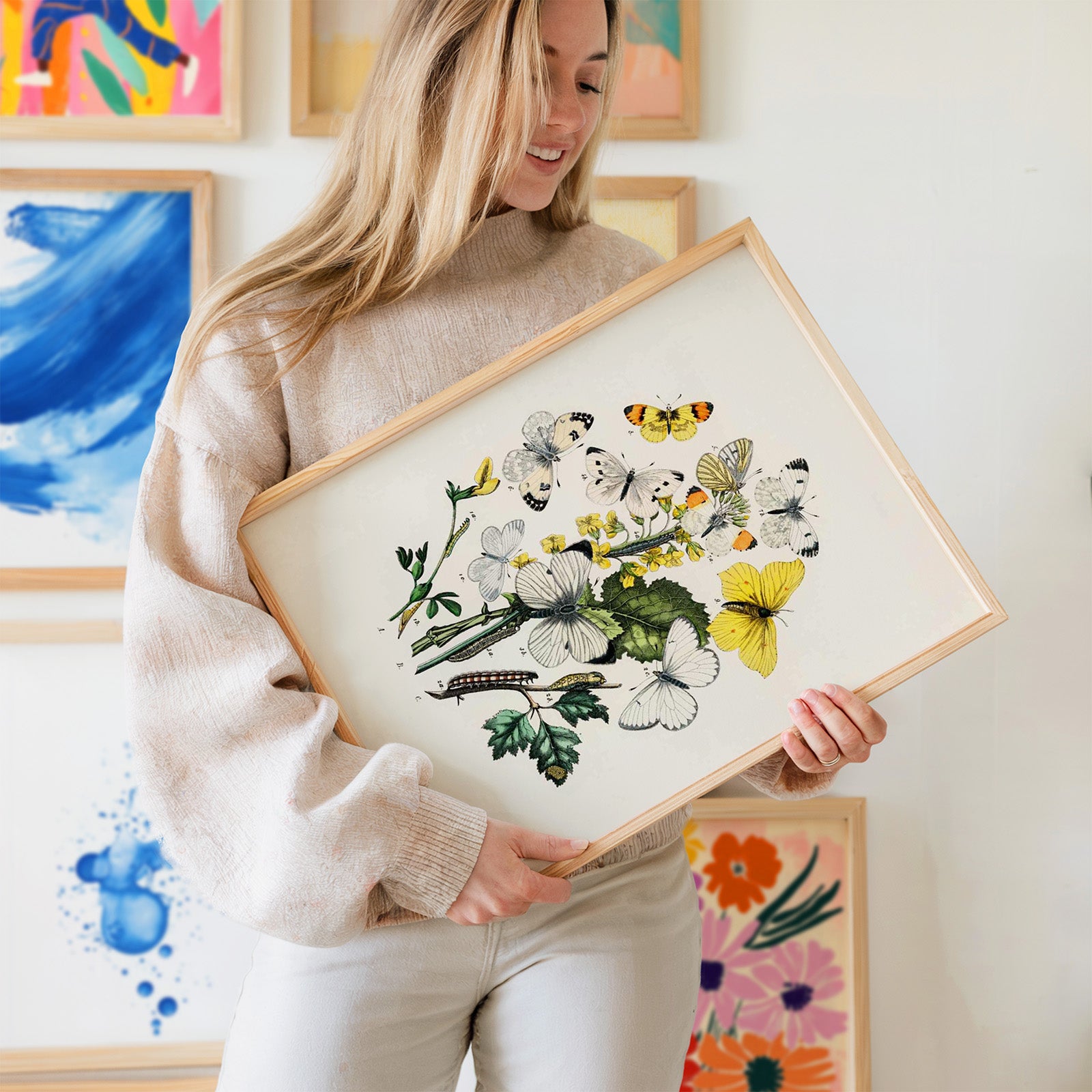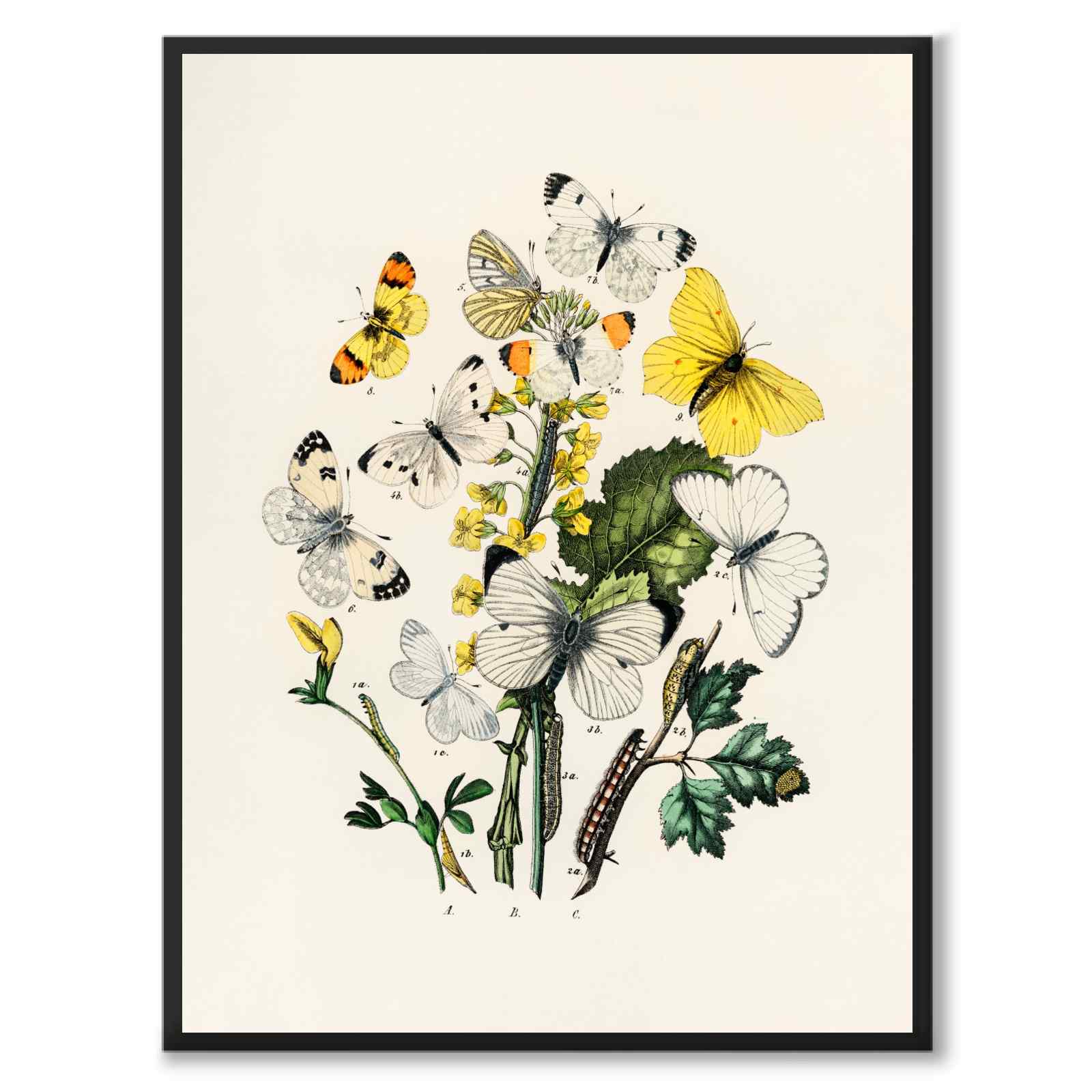 Poster med den klassiska illustrationen Fluttering butterflies and caterpillars ifrån boken European Butterflies and Moths av William Forsell Kirby, publicerad år 1882.
