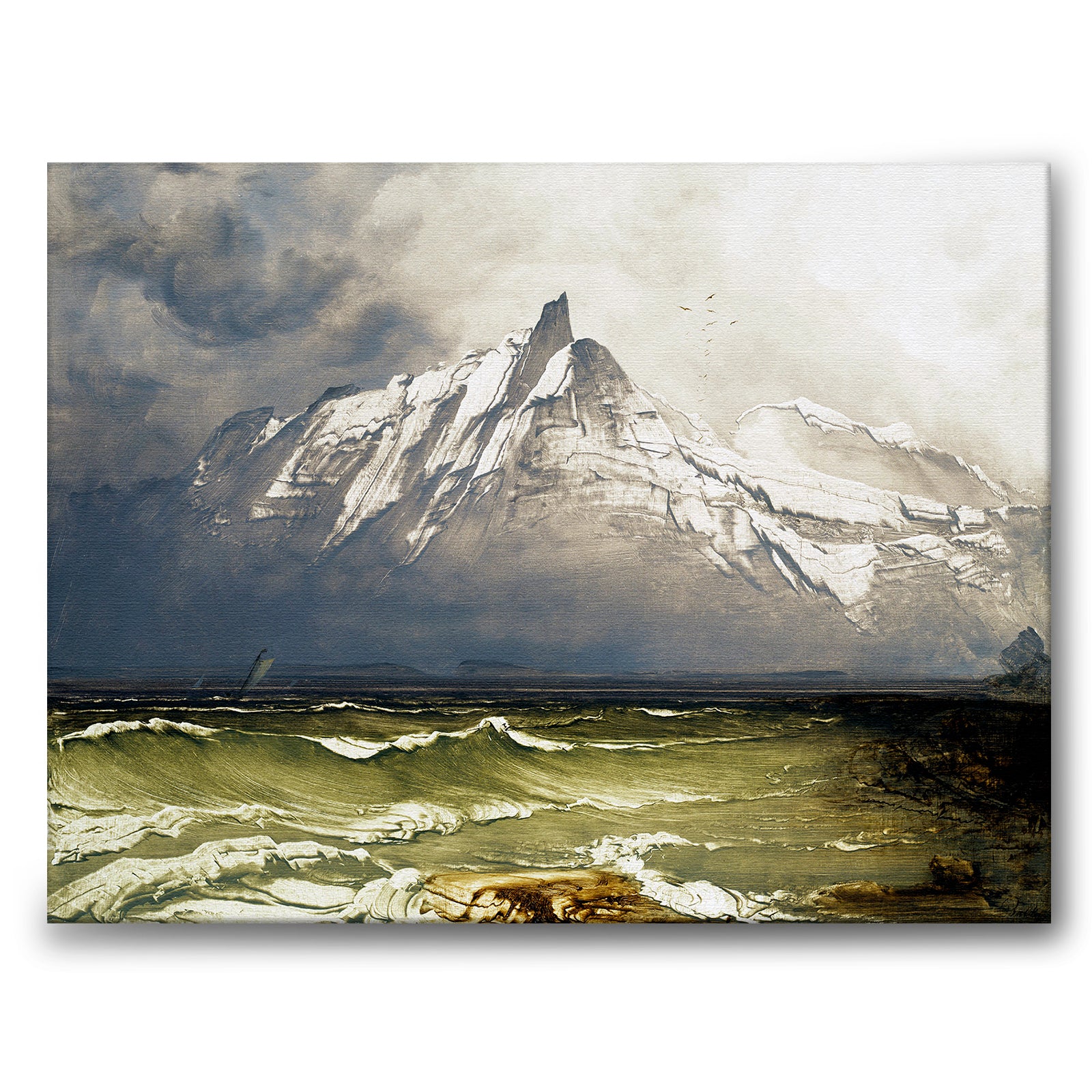 Canvas med en målning från 1800-talet av den norska landskapsmålaren Peder Balke. Motivet visar ett mäktigt landskap med norska fjäll i Nordland och ett stormigt hav.