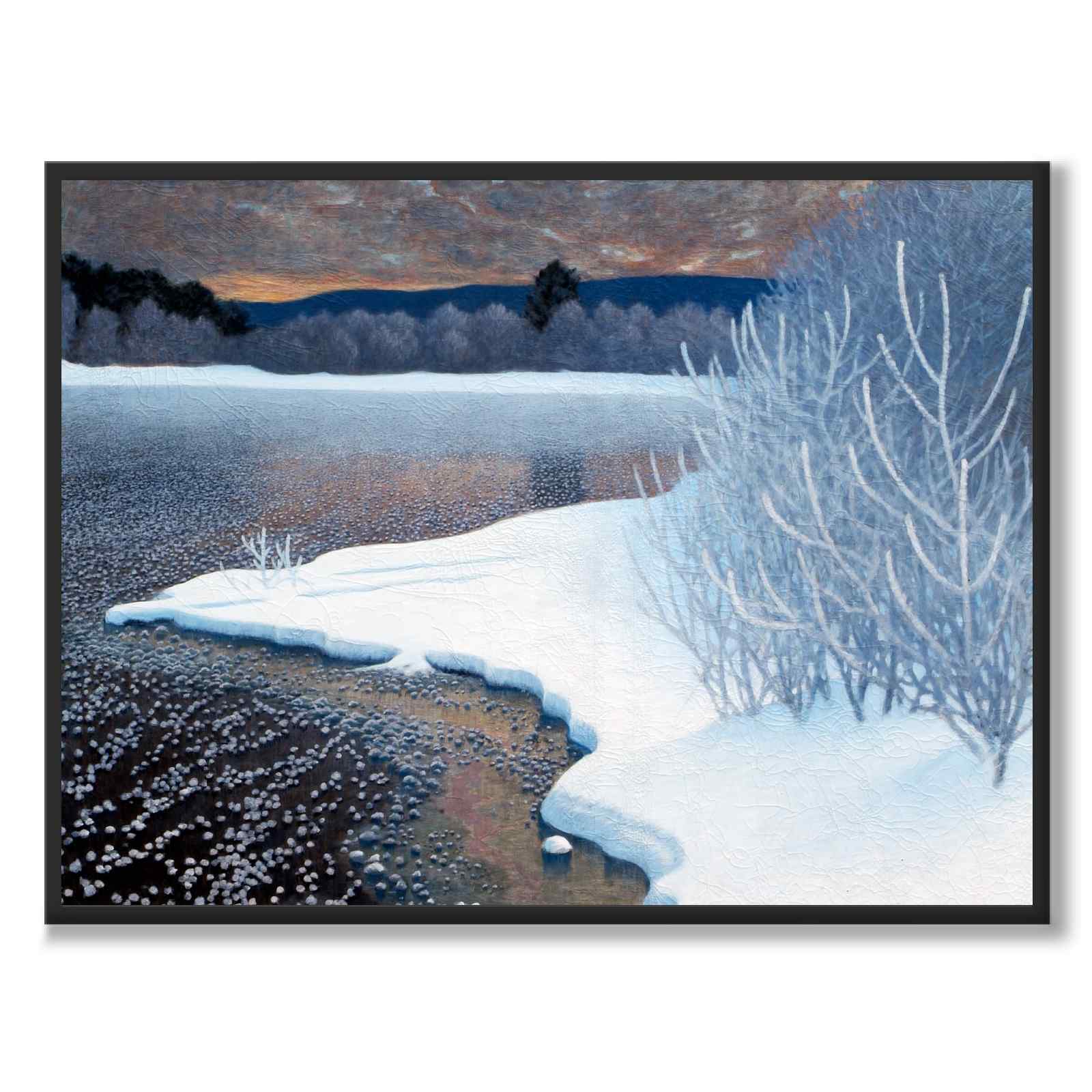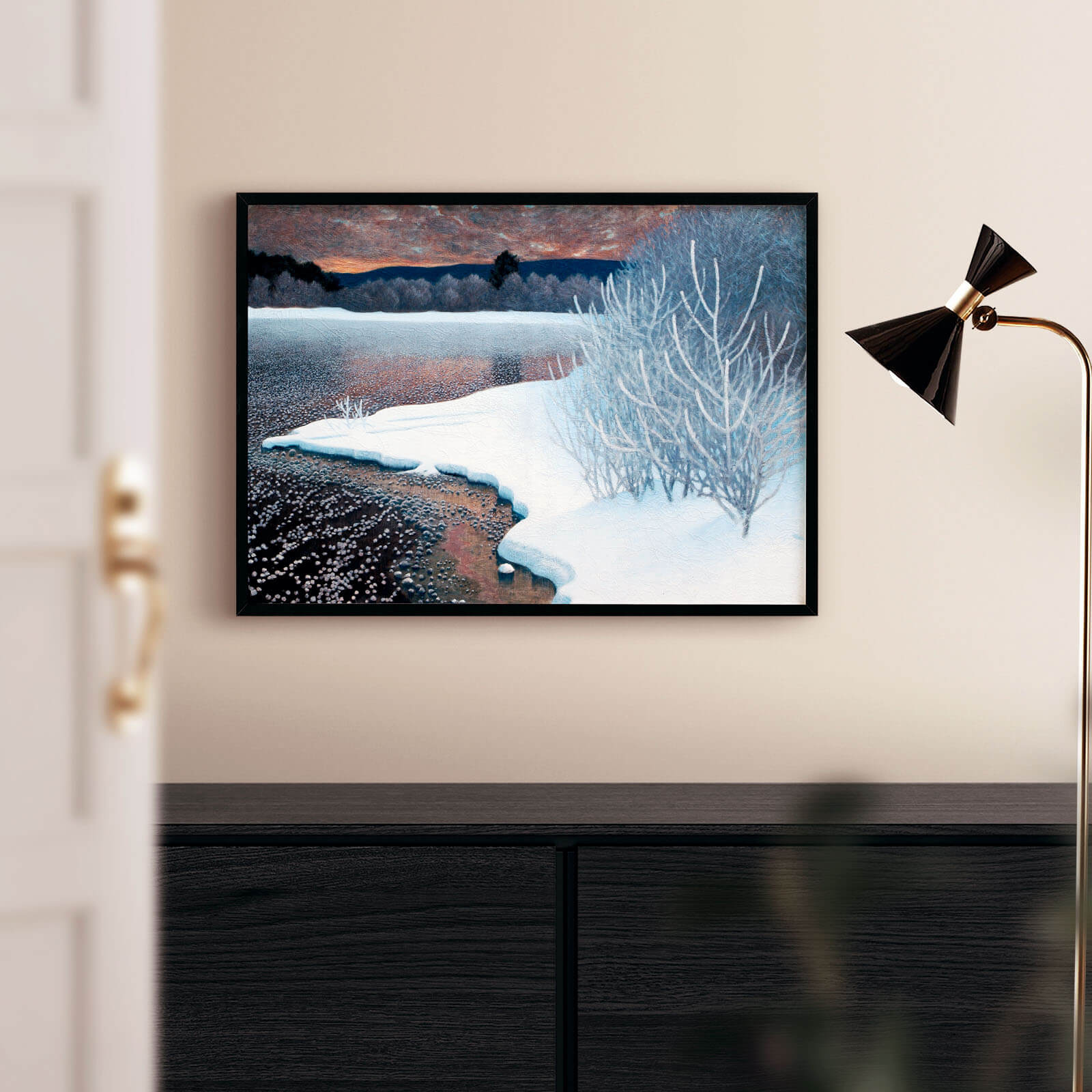 Poster med en målning från 1901 föreställande ett vackert vinterlandskap. Målningen är gjord av Gustaf Fjæstad (1868-1948) som var började sin konstnärskarriär som medhjälpare åt Bruno Liljefors under tiden som han utförde dekorationsarbeten åt Biologiska museet. Efter den tiden fick Fjæstad både Bruno Liljefors och Carl Larsson som sina handledare.