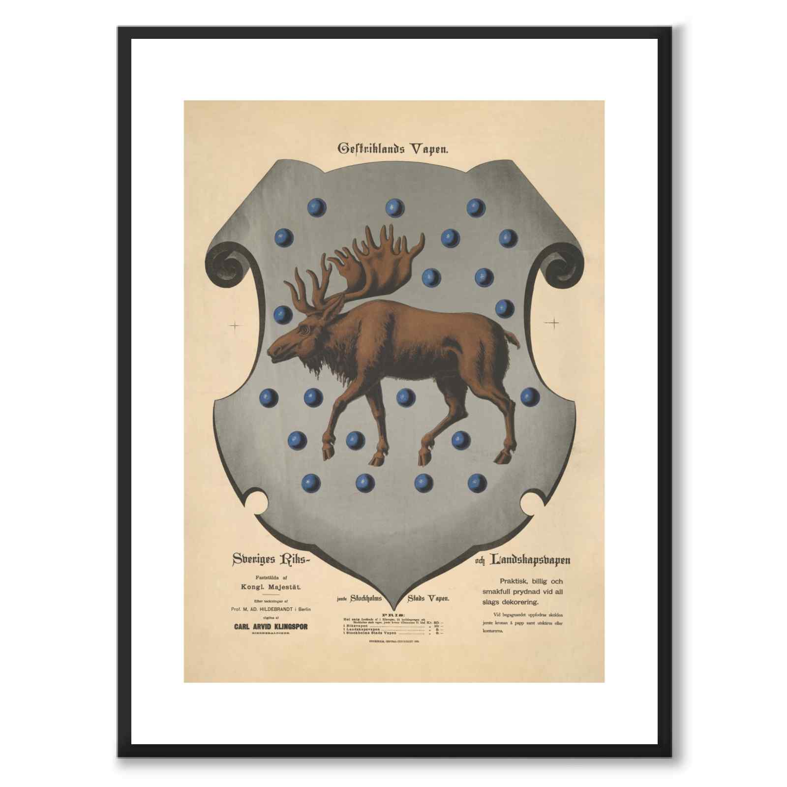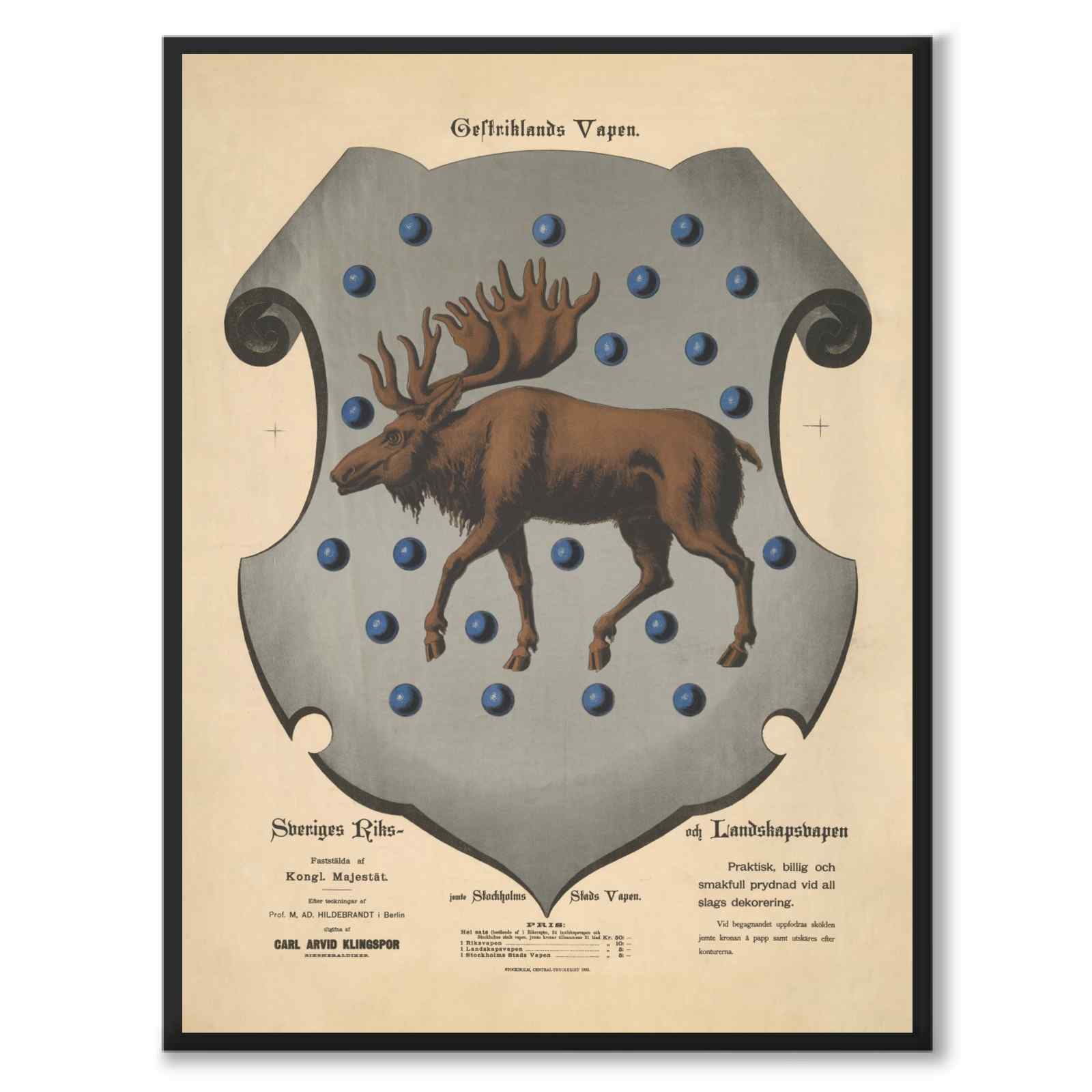 Texten ovanför vapnet lyder: Gestriklands Vapen. Längst ner till vänster står det: "Sveriges Riks- och Landshapensvapen. Fastställda af Kongl. Majestät. Efter teckningar af Prof. M. AD. Hildebrandt i Berlin. Utgifna af Carl Arvid Klingspor."
