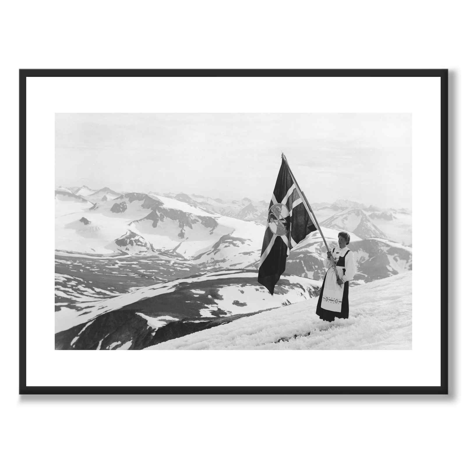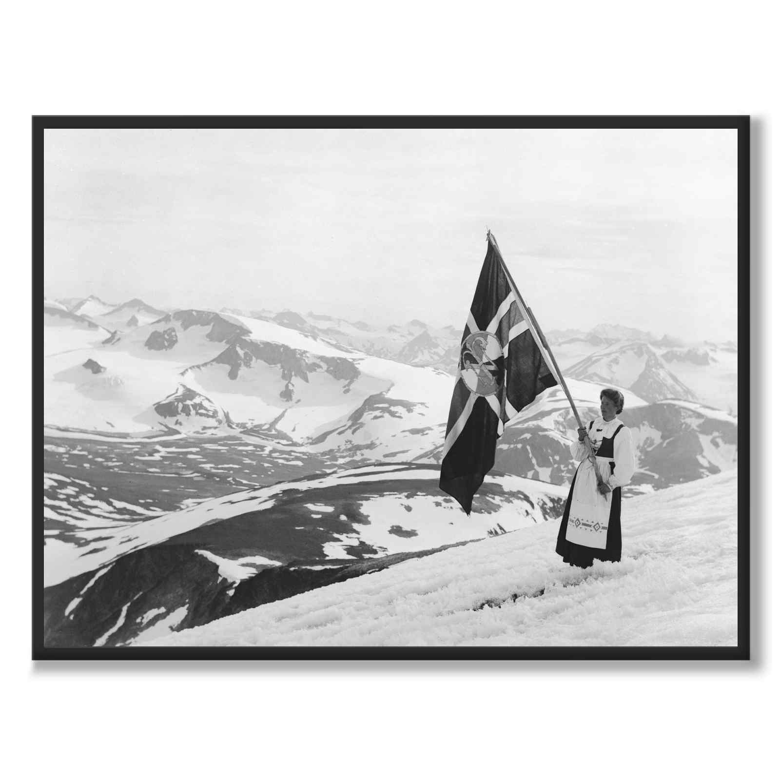 Poster med ett vackert fotografi av en kvinna stående på Glittertind, taget 1910 av Anders Beer Wilse. Kvinnan är klädd i traditionell folkdräkt, bärandes på Glittertind Turistforeningens flagga