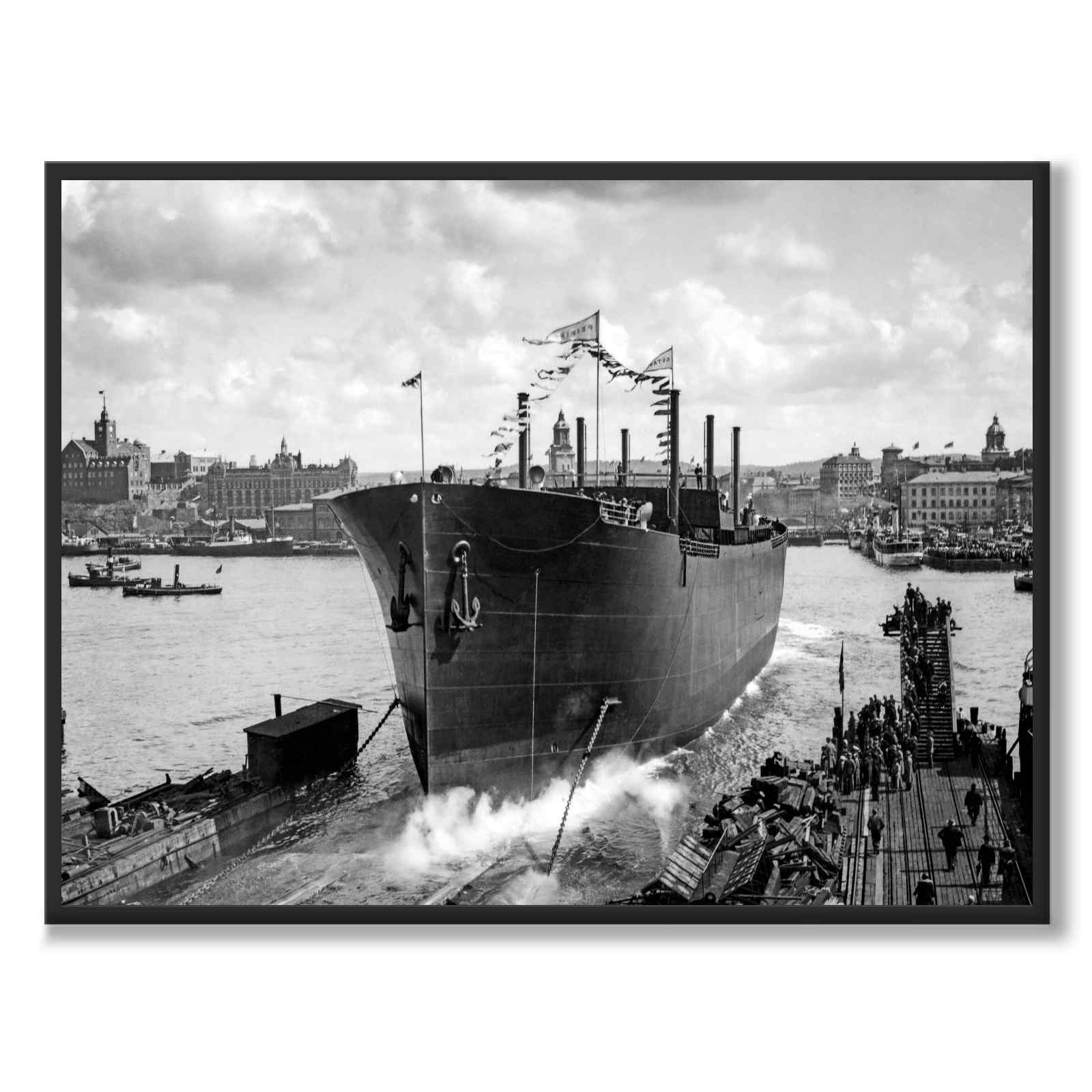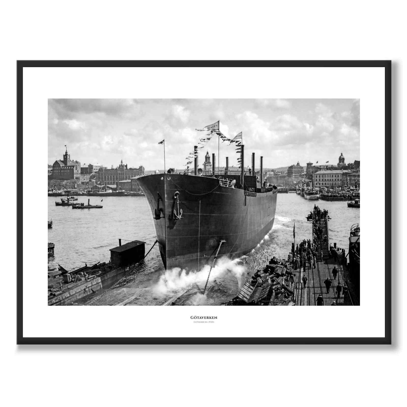 En häftig bild på en högtidlig sjösättning av ett fartyg på Götaverken i Göteborg på 1930-talet. Händelsen har samlat en stor publik på båda sidor av älven som samlats för att se fartyget glida ned i havet för första gången.