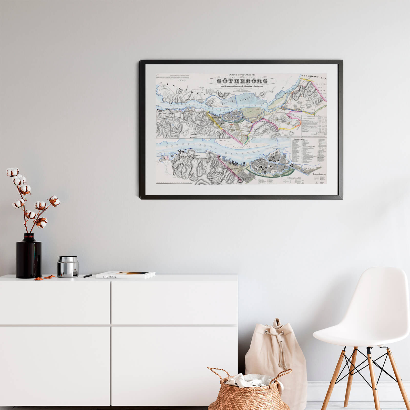 Poster med en gammal karta från 1855 över Göteborg, eller Götheborg som det då hette, och dess omgivningar. På kartan ser vi allt från Hisingen till Frölunda och Kålltorp.