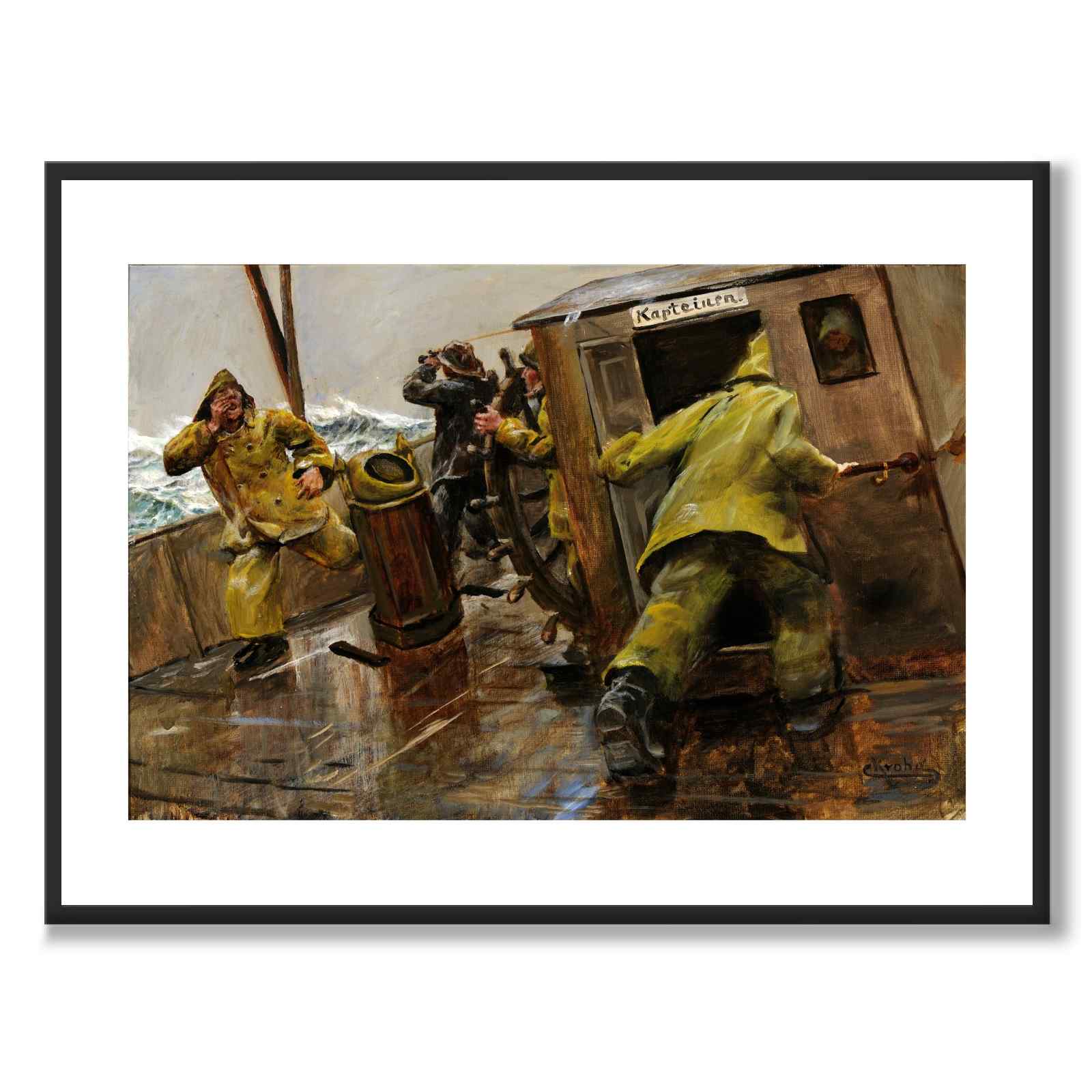 Målningen gjordes år 1905 och skildrar en dramatisk scen ombord på ett fartyg under stormiga förhållanden, där flera sjömän kämpar för att kontrollera båten och reagerar på en nödsituation.