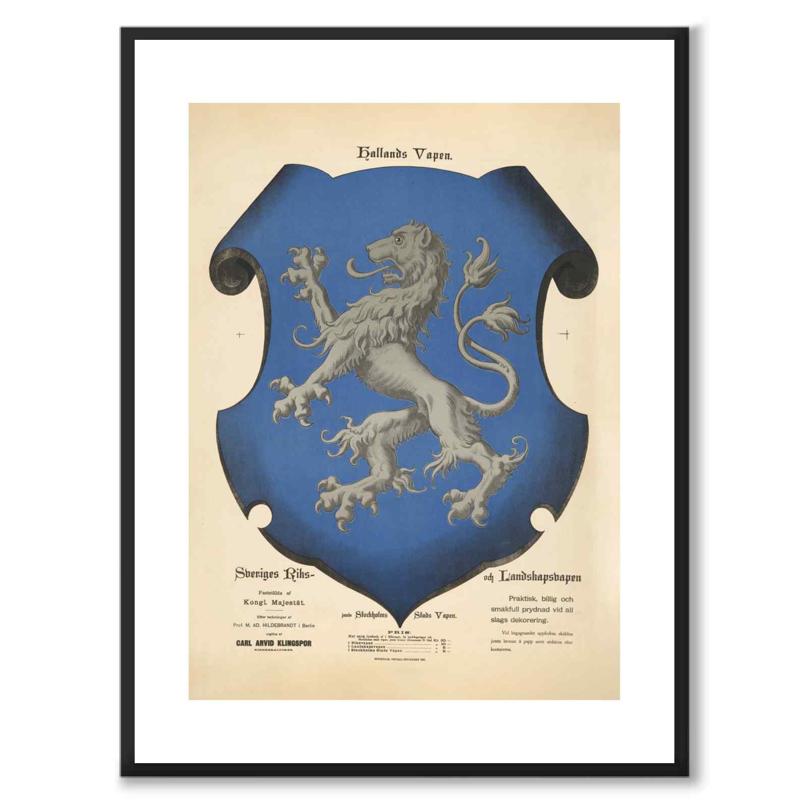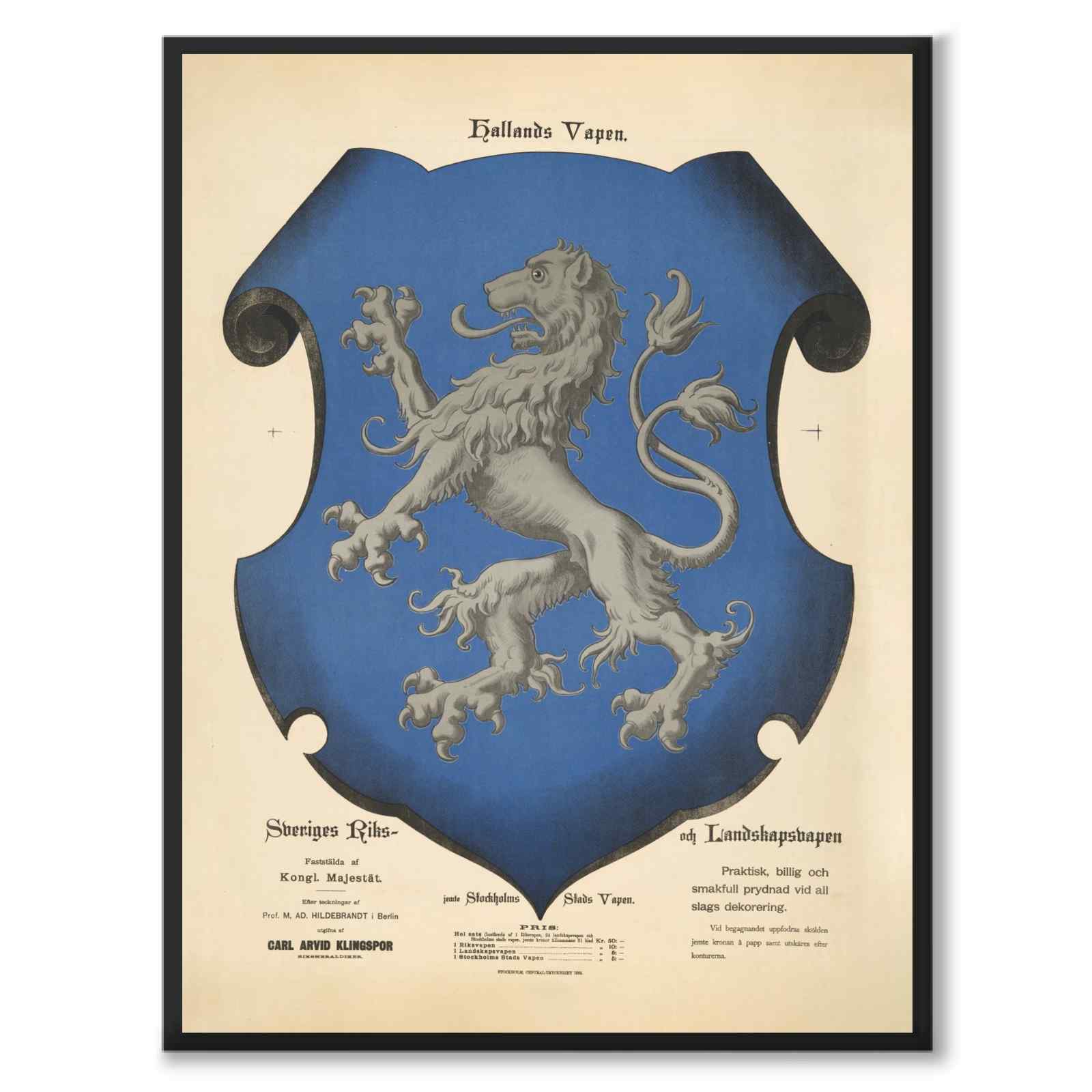 Texten ovanför vapnet lyder: Hallands Vapen. Längst ner till vänster står det: "Sveriges Riks- och Landshapensvapen. Fastställda af Kongl. Majestät. Efter teckningar af Prof. M. AD. Hildebrandt i Berlin. Utgifna af Carl Arvid Klingspor."