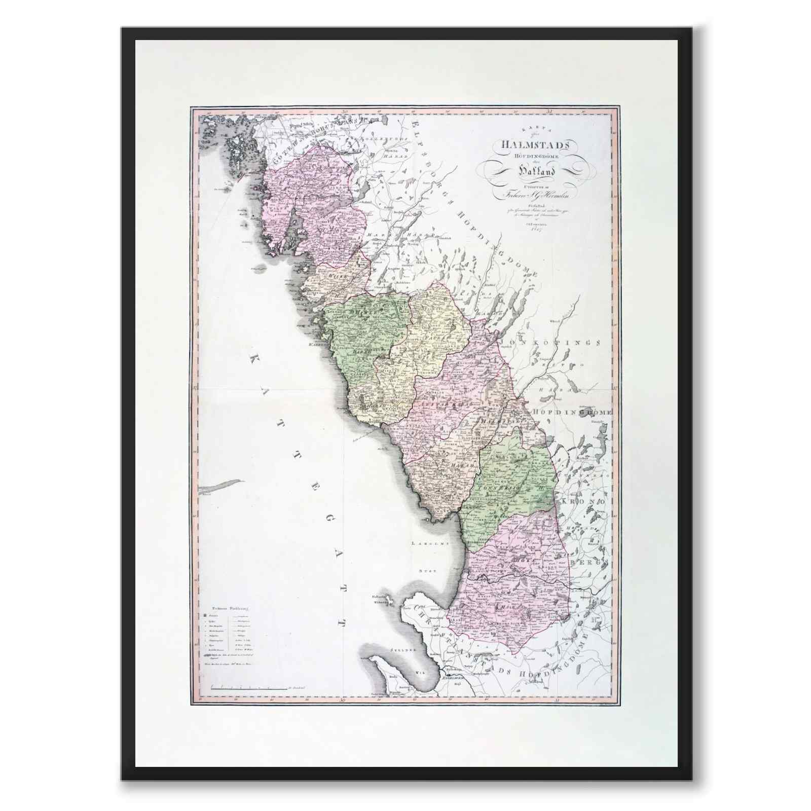 Poster med en karta över Halland och dess omgivningar år 1807. På kartan ser vi allt från Hönö, Göteborg, Härryda och Bollebygd i norr till och Höganäs, Ängelholm och Fagerhult i Syd. Markerat i färg i mitten ser vi Halland, eller Halmstad som hela området hette på tidigt 1800-tal. Uppe till höger på kartan ser vi texten: "Karta öfver Halmstads höfdingdöme eller Halland". En fantastisk bild över en stor del av Sveriges västkust.