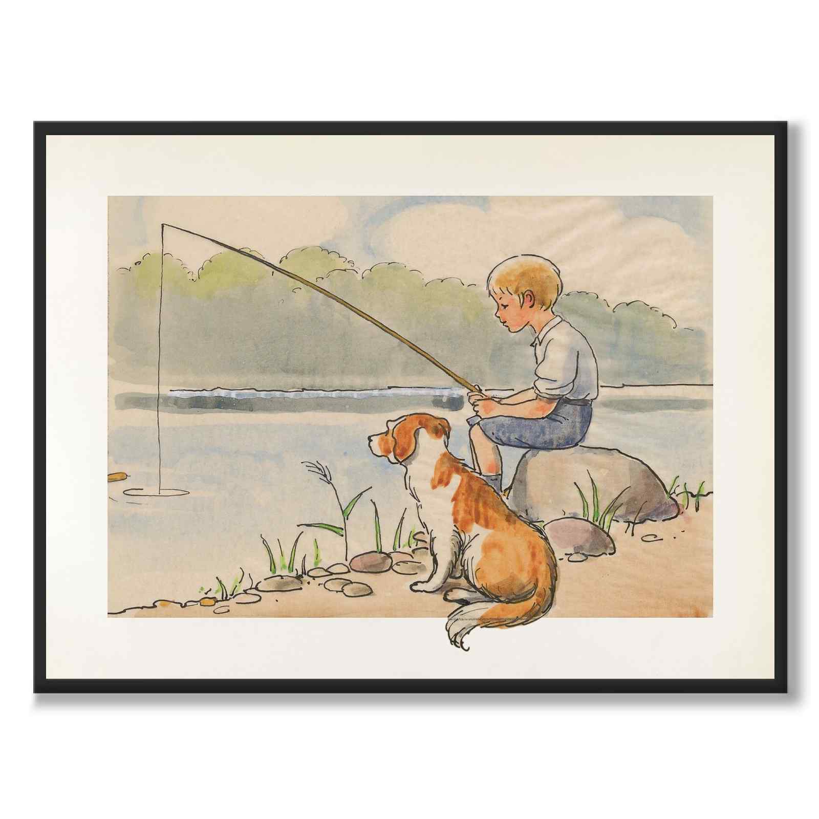 Bilden visar en pojke sitter på en sten vid strandkanten och fiskar i en stilla sjö. Bredvid honom sitter en hund och tittar uppmärksamt ut över vattnet, medan vass och stenar ramar in förgrunden och skog syns i bakgrunden.