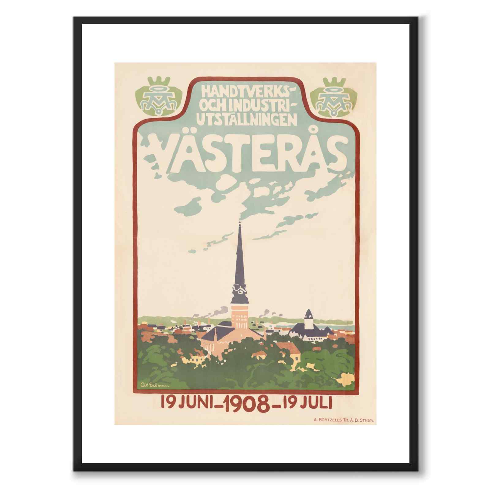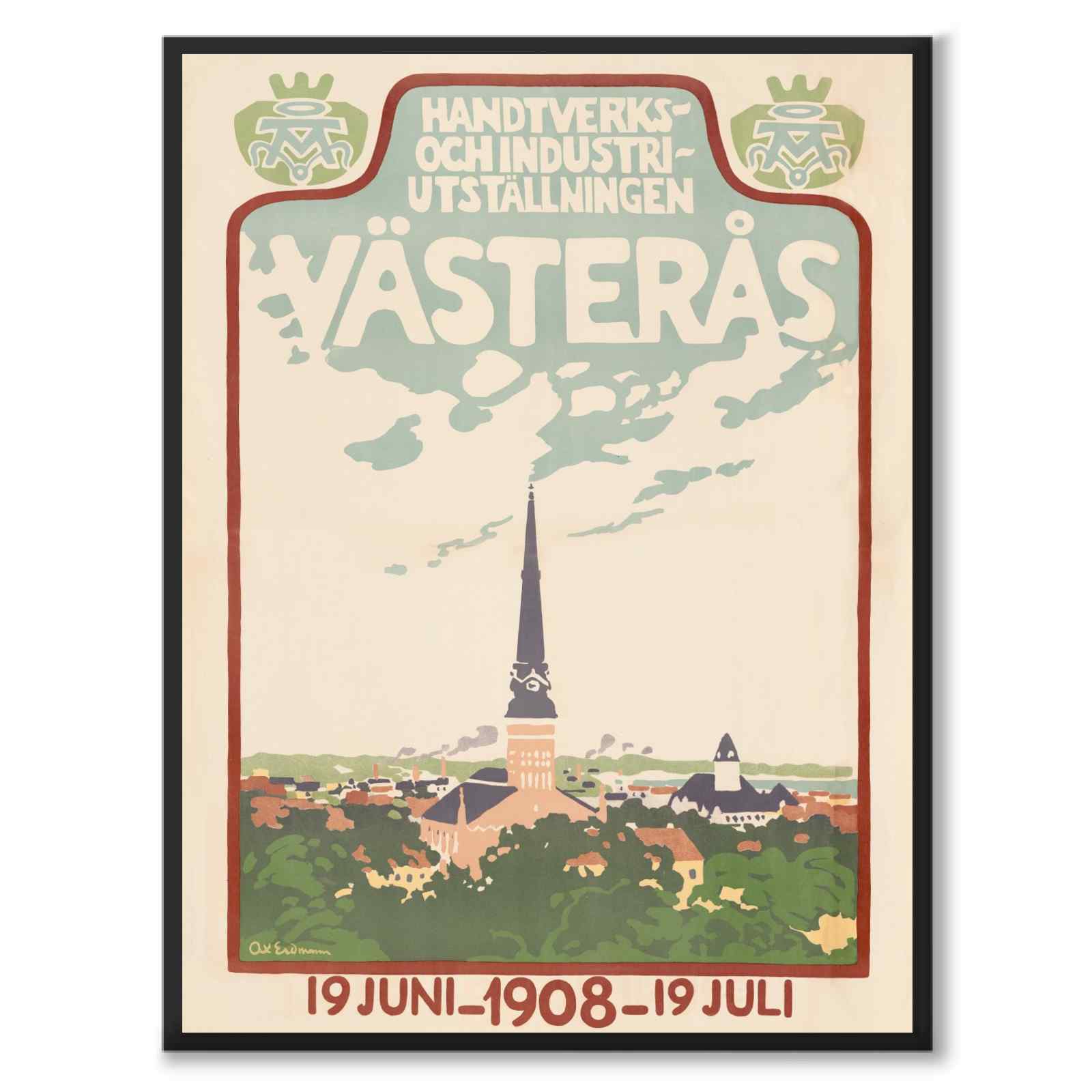 Poster med en affisch skapad av den svenska konstnären Axel Erdmann (1814-1869). Affischen berör Hantverks- och Industriutställningen i Västerås år 1908.