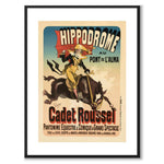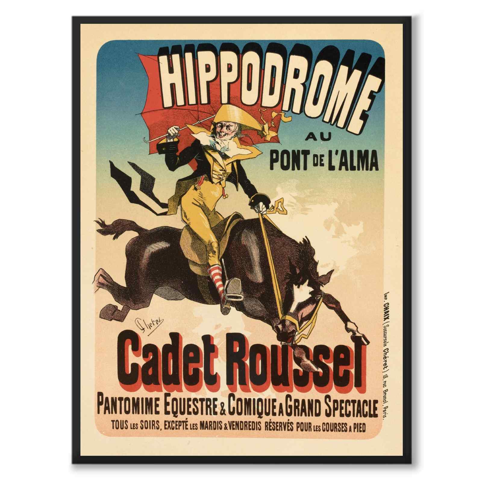 Affischen Hippodrome marknadsförde en föreställning på Hippodrome de Paris, en populär nöjesarena där man visade cirkus, akrobatik och andra spektakulära uppträdanden. Bilden skildrar en cirkusperson som rider på en häst, med ett rött paraply i ena handen.