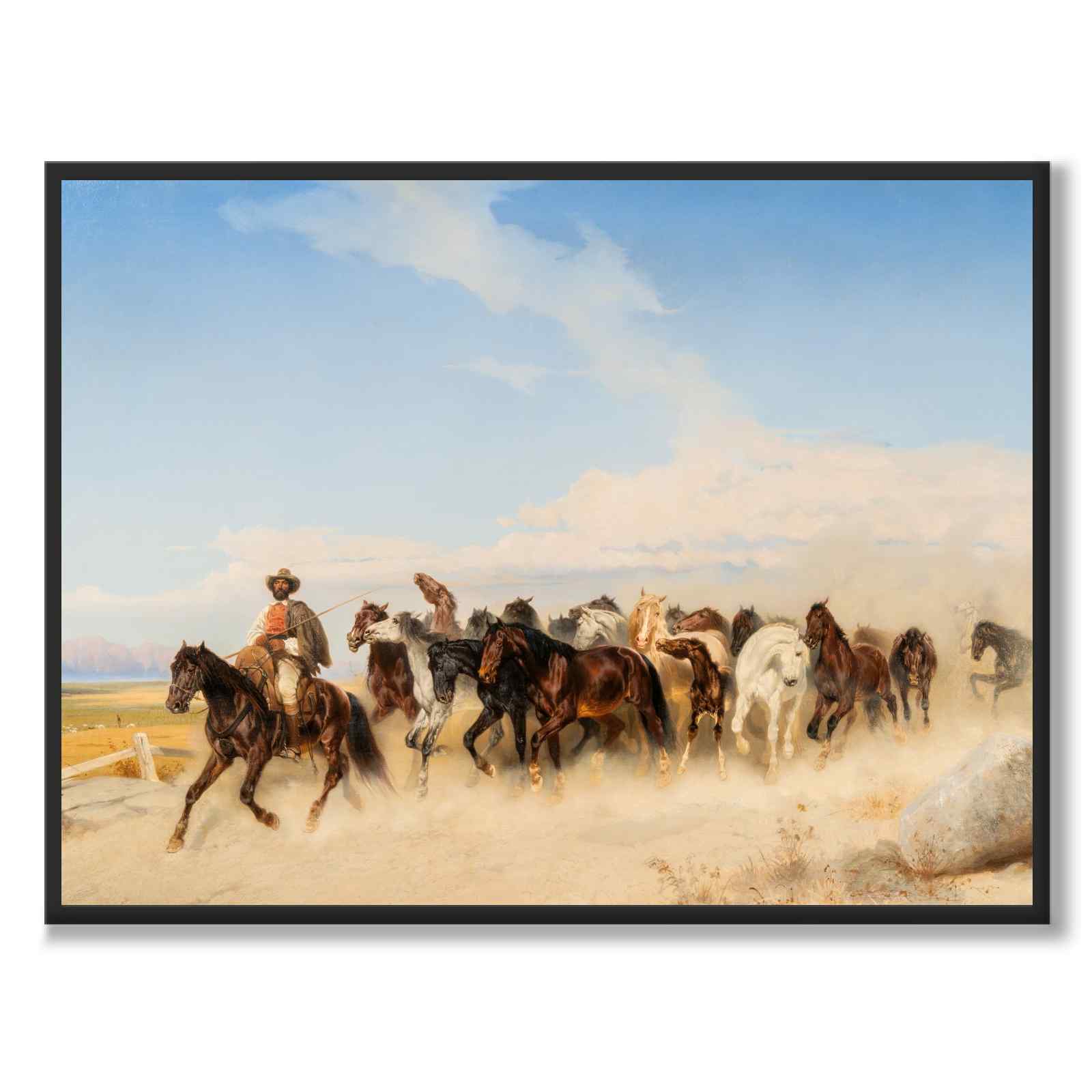 Carl Wahlbom var en av Sveriges mest populära historiemålare under 1800-talet. Den fängslande målningen föreställer en ridande man som leder en flock hästar i ett vackert landskap i Campagna, Italien. Det är en oljemålning skapad med vackra, starka färger.
