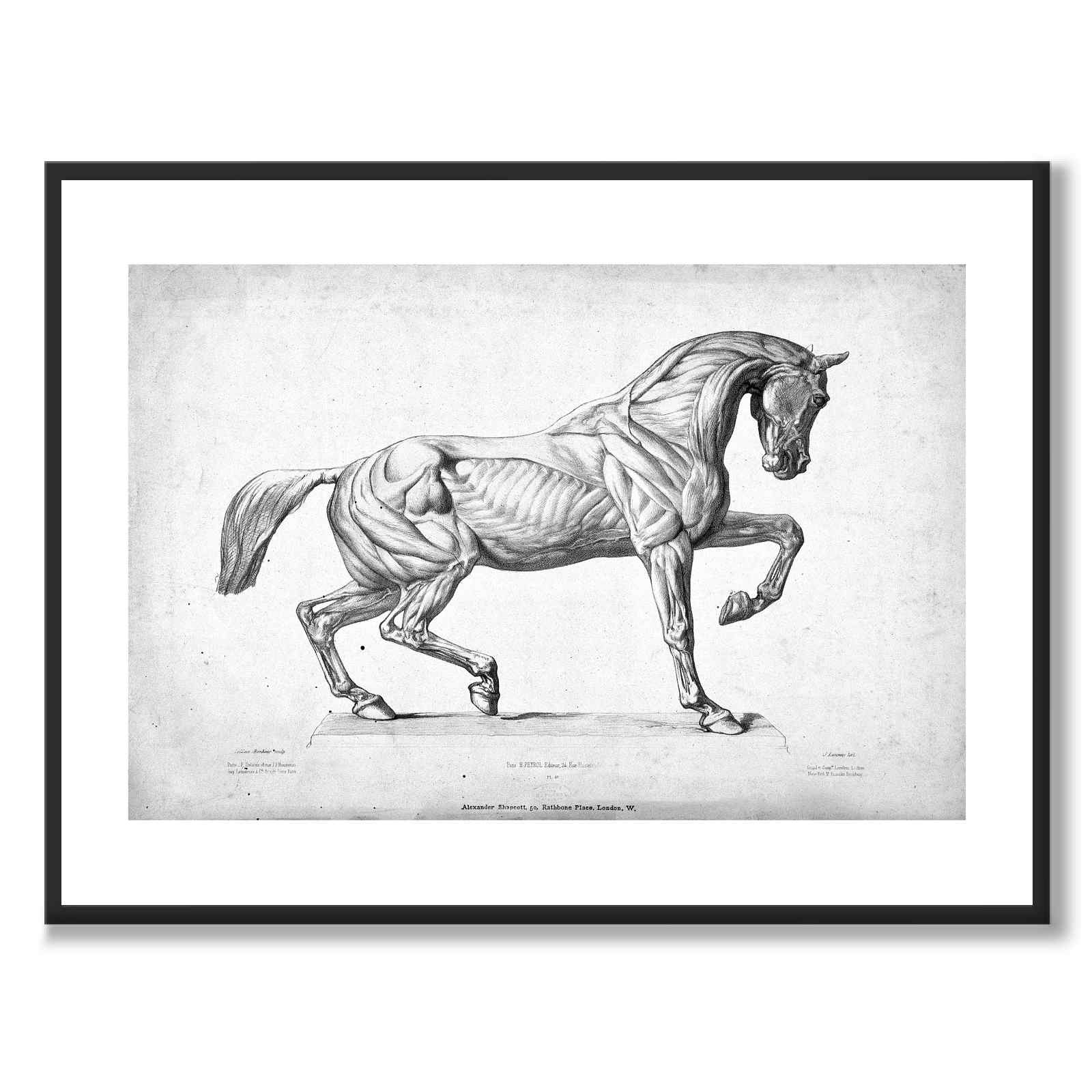 Illustrationen visar en ståtlig häst i profil, återgiven med stor noggrannhet i både proportioner och detaljer. Bonheur framhäver djurets elegans, muskulatur och lugna men alerta hållning, vilket ger motivet en känsla av både värdighet och närvaro.
