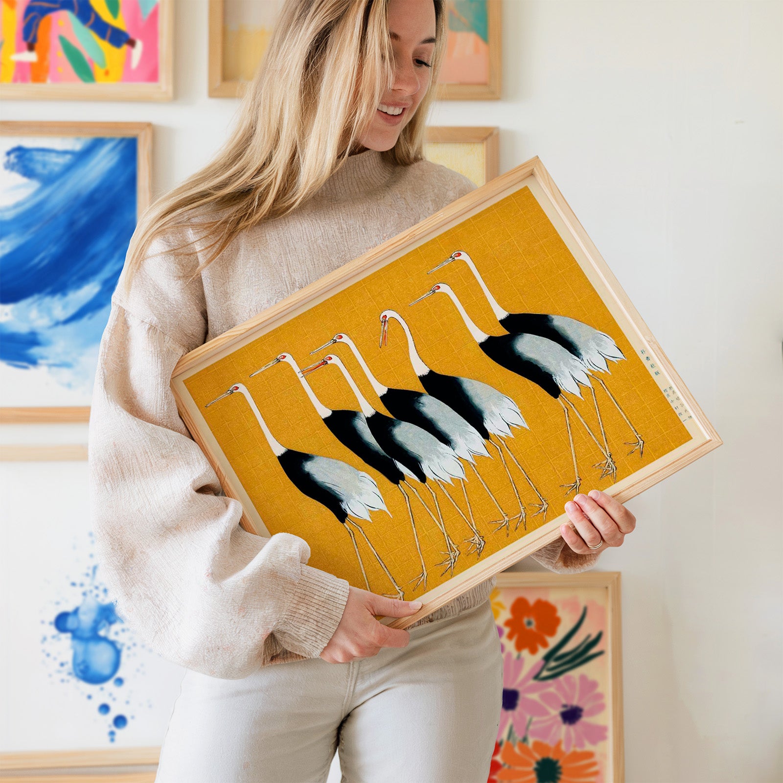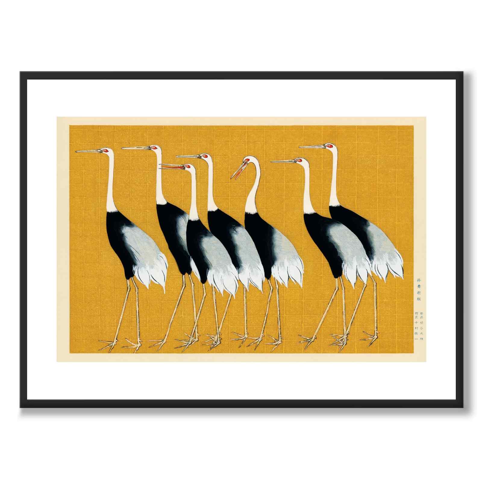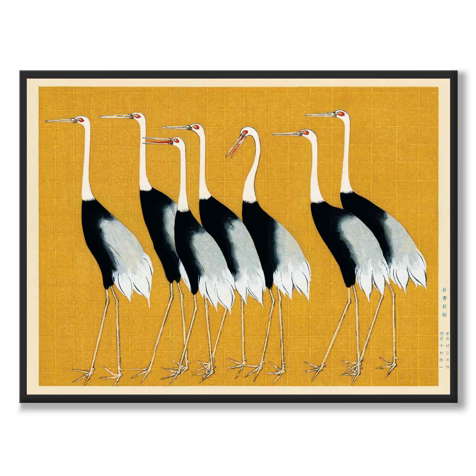 Poster med den kända illustrationen Japanese Red Crown Crane av Ogata Korin från början av 1700-talet. Illustrationen visar en flock japanska tranor mot en gul bakgrund. Fåglarna symboliserar lycka, lång livslängd och fred i den japanska kulturen.