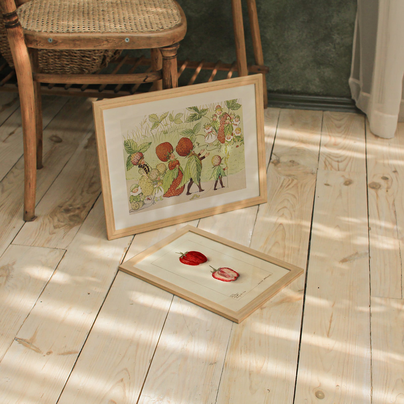 Poster med illustration av jordgubbar från tidigt 1900-tal. Jordgubben tillhör familjen Rosaceae och släktet Fragaria. Trots sitt namn är den inte ett "riktigt" bär enligt botanisk definition eftersom dess frön ligger på utsidan av frukten.