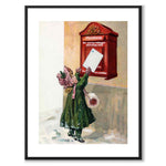 Poster med ett klassiskt julmotiv av Jenny Nyström från 1915. En ung flicka sträcker på sig när hon postar ett kuvert en vinterdag.