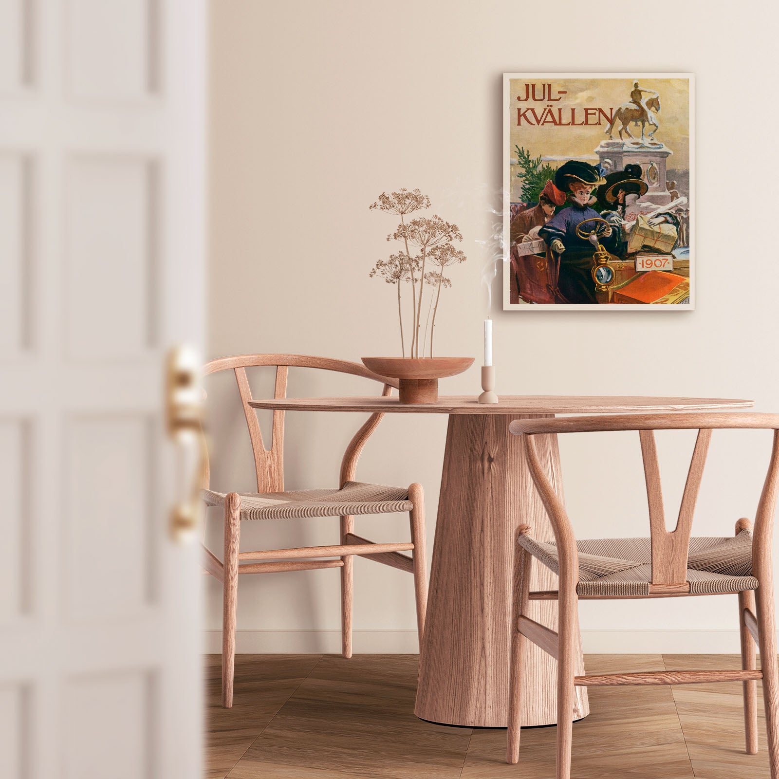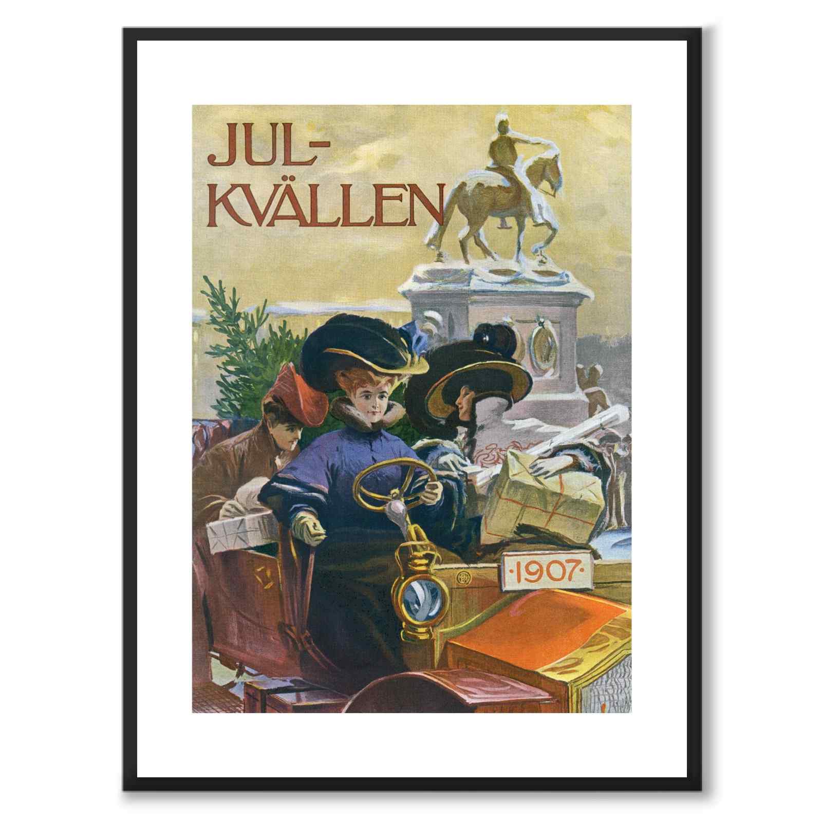 Poster med ett vackert julmotiv med ett omslag från tidsskriften Julkvällen från 1907. Motivet visar tre välklädda damer i en fin bil, de har bilen full med julklappar och en gran i bakluckan.
