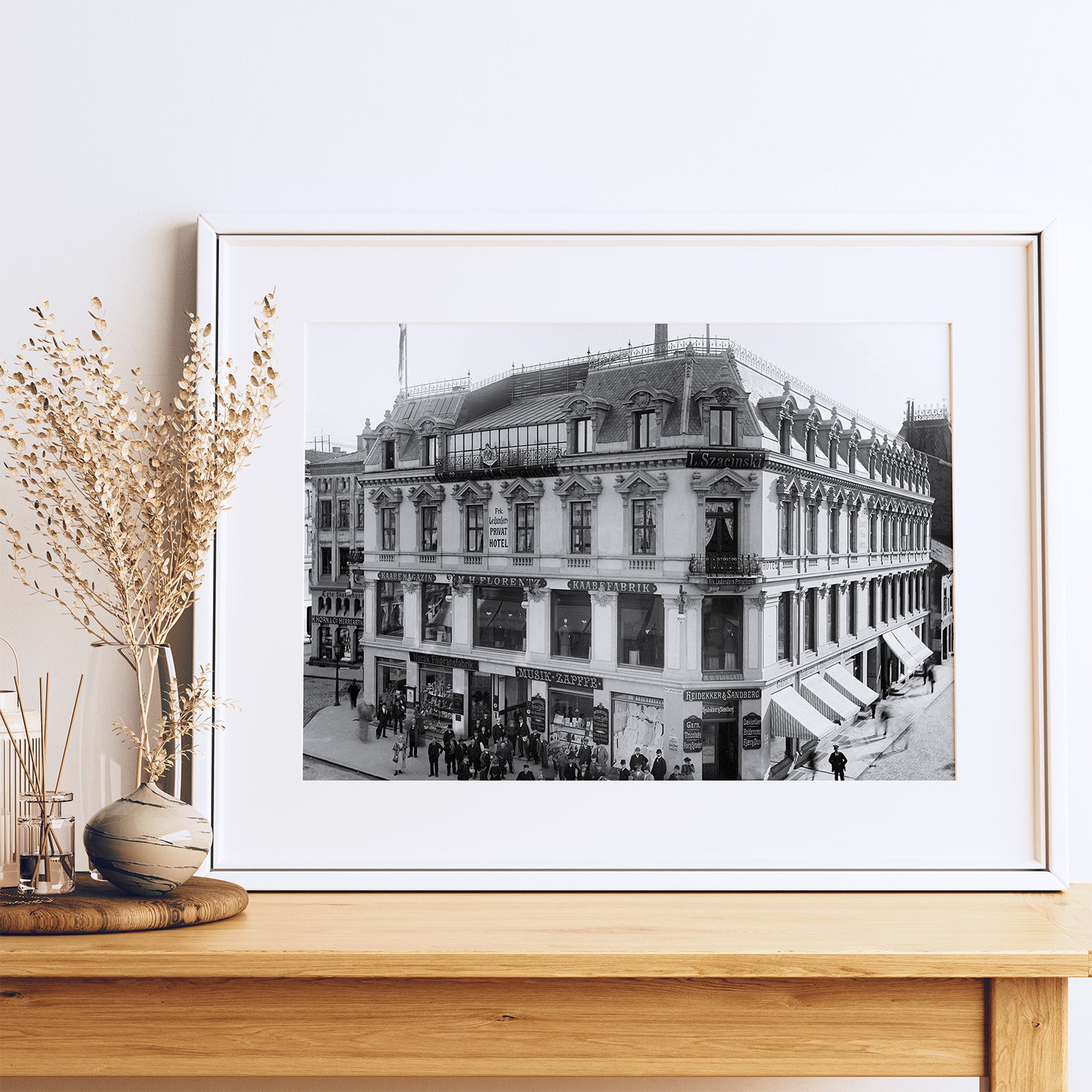 Poster med ett fotografi av Karl Johans gate 20 i Oslo från år 1898.
