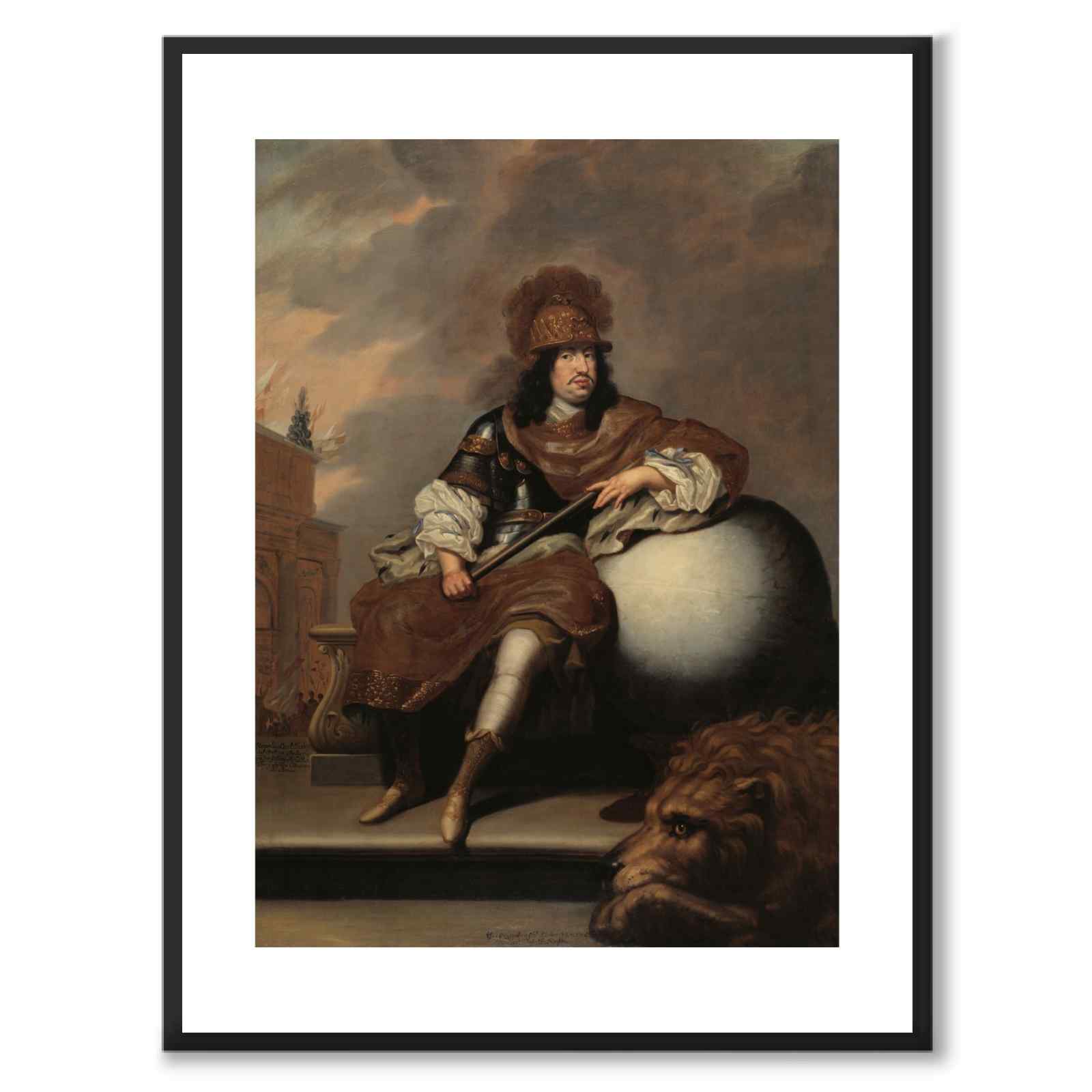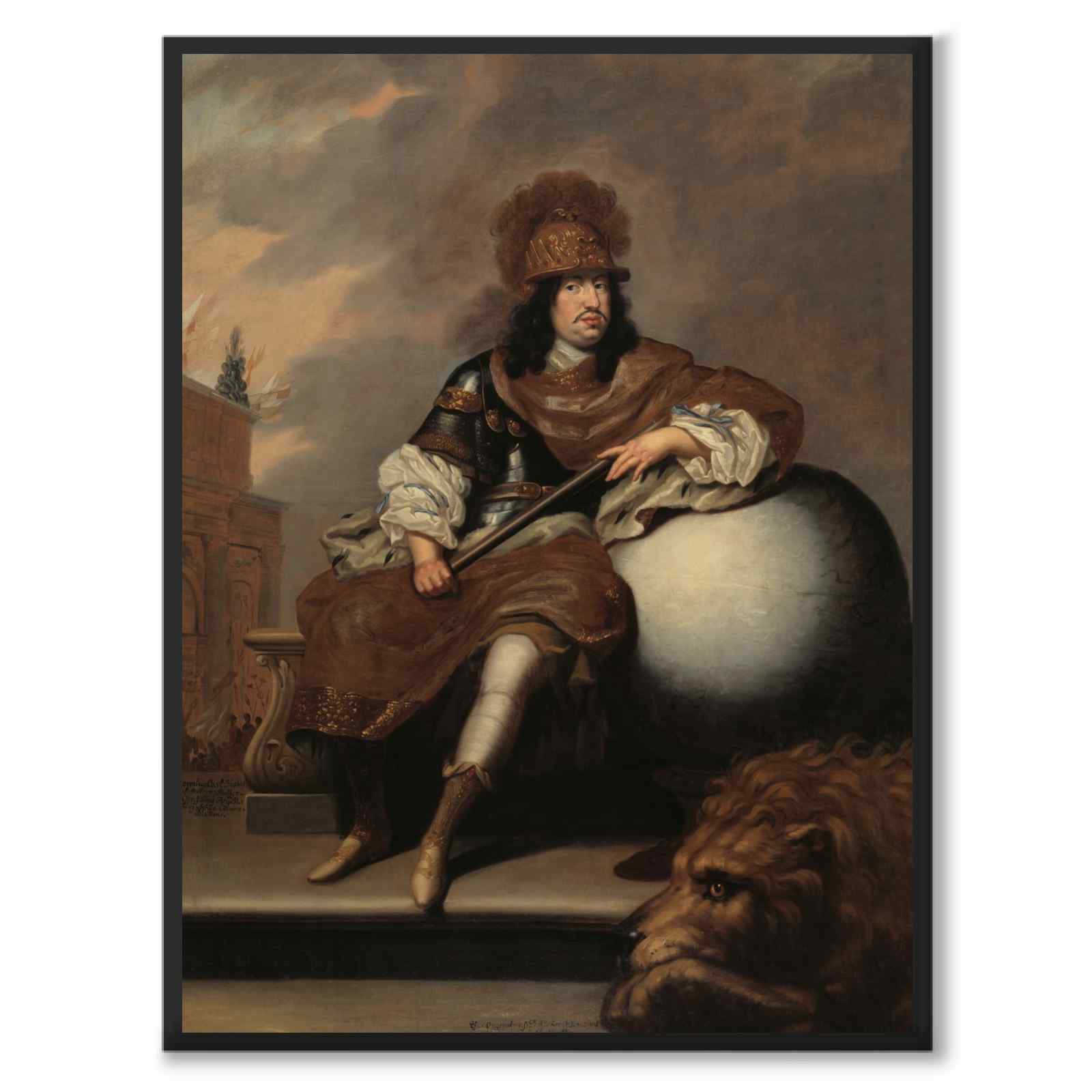 Poster med en vacker tavla målad av David von Krafft, en tysk målare och konstnär. Bilden är ett porträtt av Karl X Gustav som vi ser poserar under en mäktig himmel.