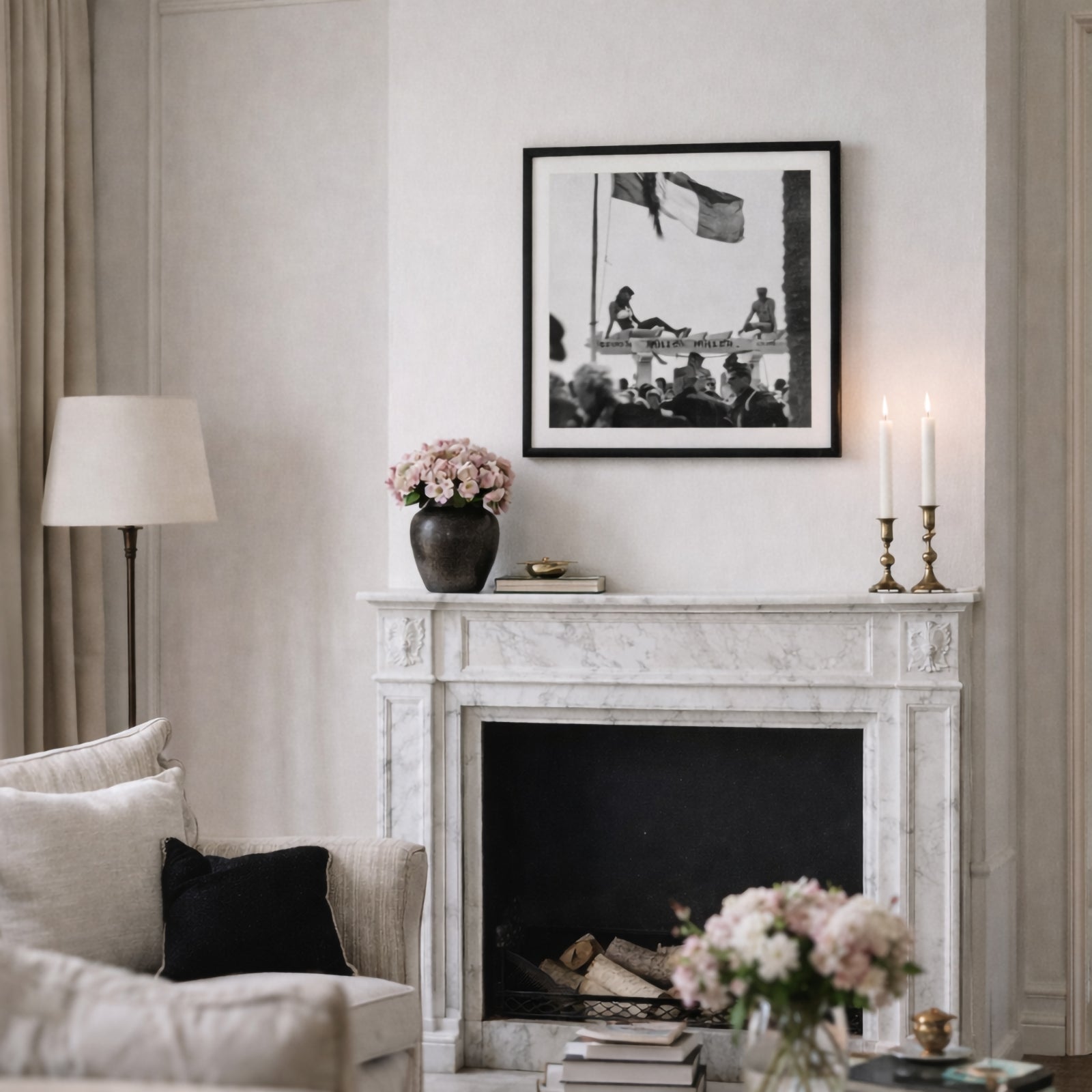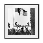 Karys fotografi fångar en livfull strandscen i Cannes under 1950-talet, där en kvinna vilar med elegans ovanpå en pirstruktur medan folkmassor samlas nedanför. Den franska flaggan böljar ovanför och tillför ögonblicket en känsla av festlighet och glamour.