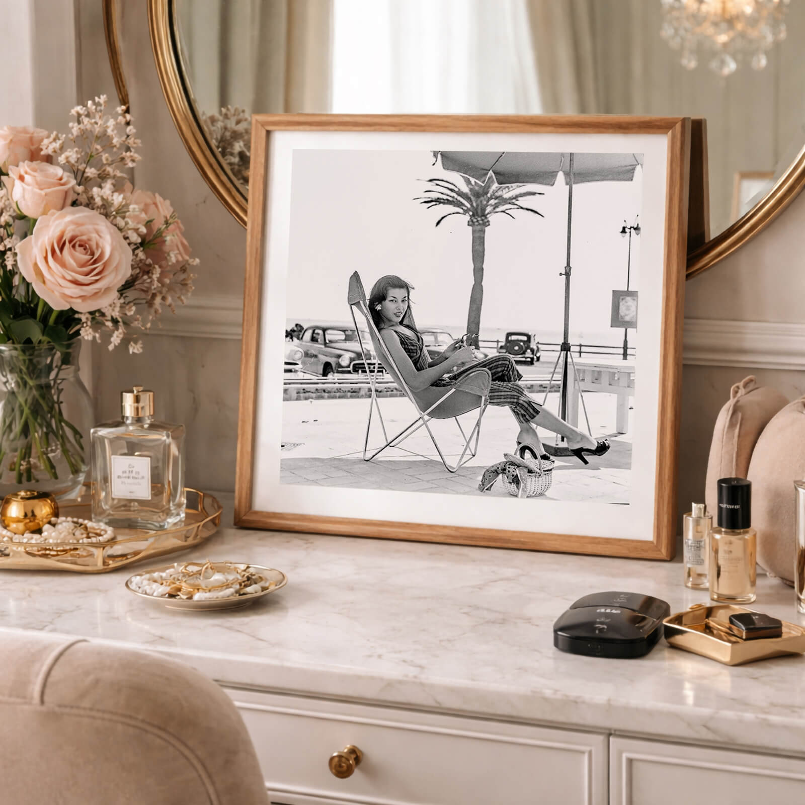 France Nuyen, fotograferad på Hôtel Carlton i Cannes i mitten av 1950-talet, poserar med ungdomlig självklarhet. Avslappnad men medveten om kameran fångar bilden ett tidigt ögonblick i framväxten av en blivande filmskådespelerska, mot den franska rivierans obesvärade glamour. France Nuyen var en fransk-amerikansk skådespelerska och modell som slog igenom internationellt under 1950-talet, bland annat i South Pacific.