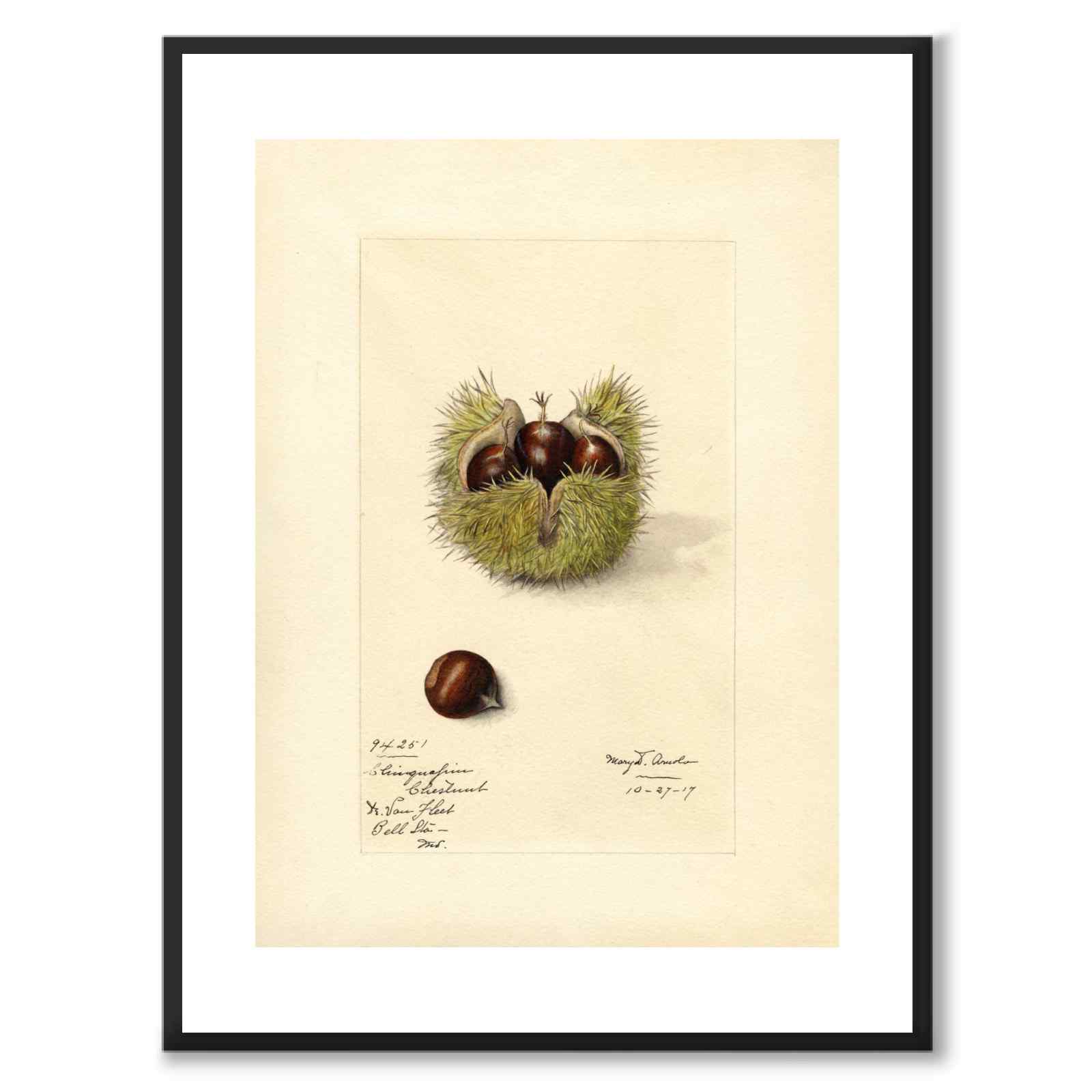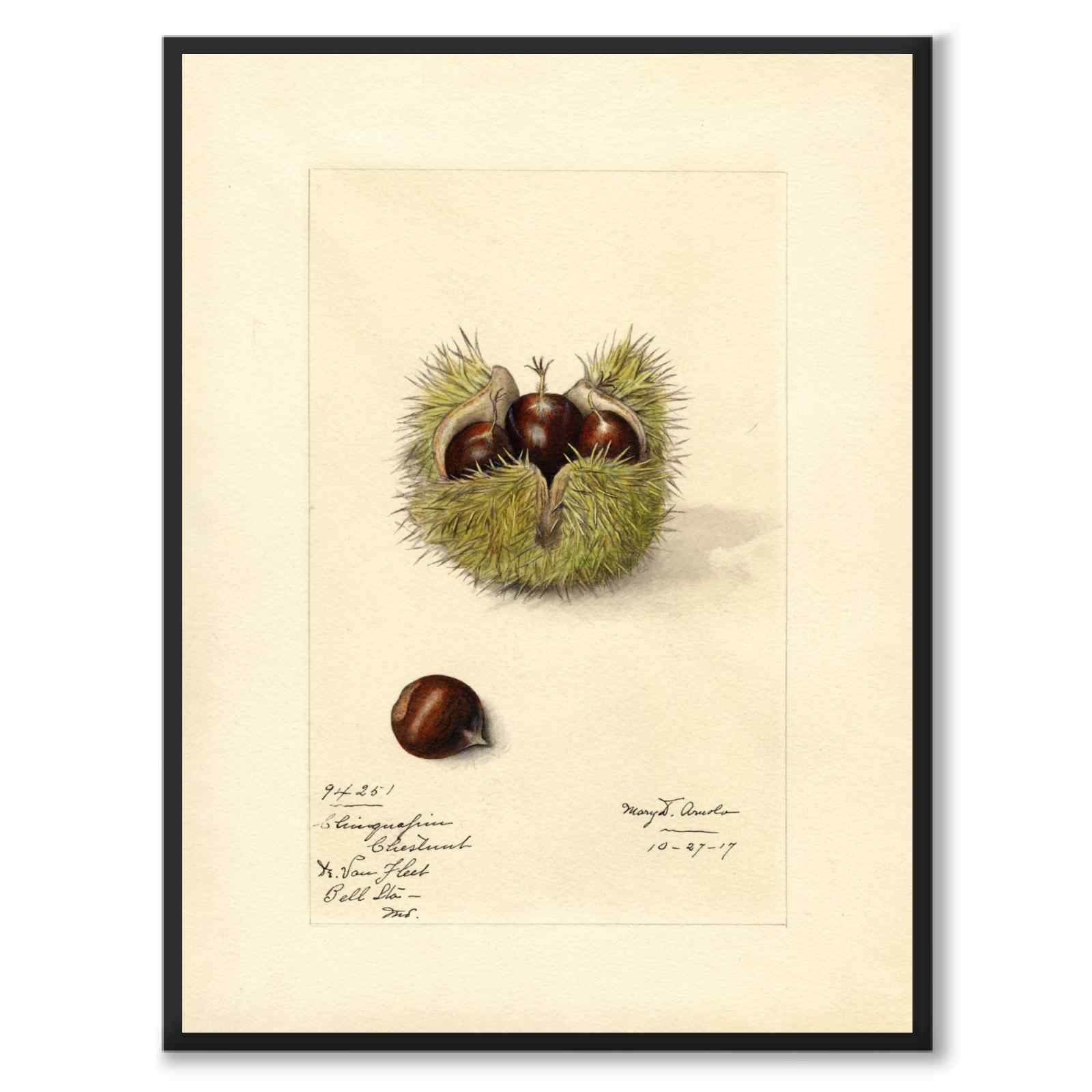 Poster med en vintage illustration av en kastanj från tidigt 1900-tal. Kastanjen är ett imponerande träd inom släktet Castanea, tillhörande familjen bokväxter (Fagaceae). Dessa träd kan växa mycket stora, ofta över 20 meter höga, och kännetecknas av sina långsträckta löv med tandade kanter.