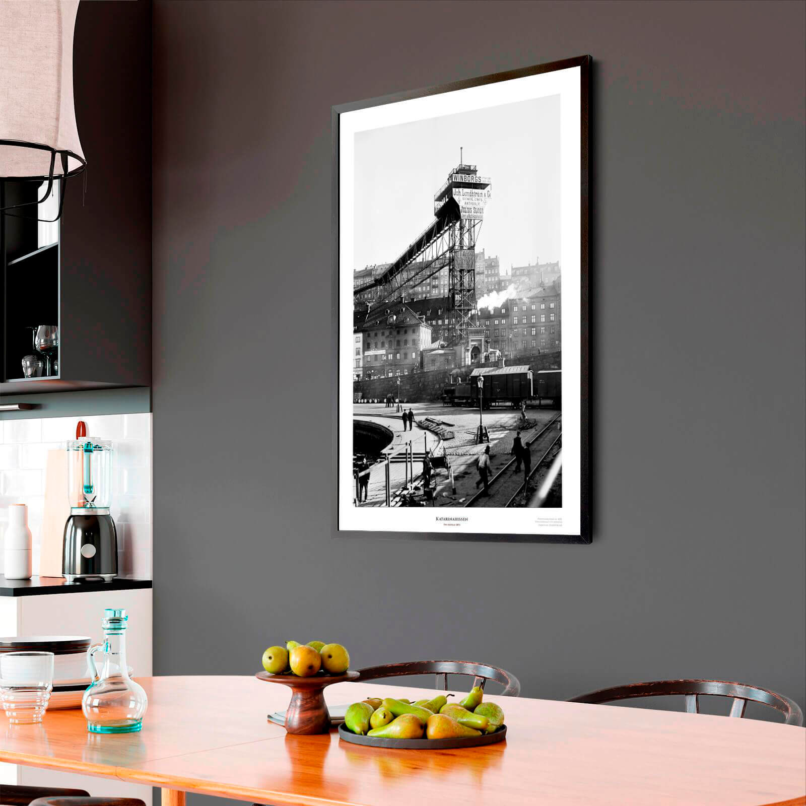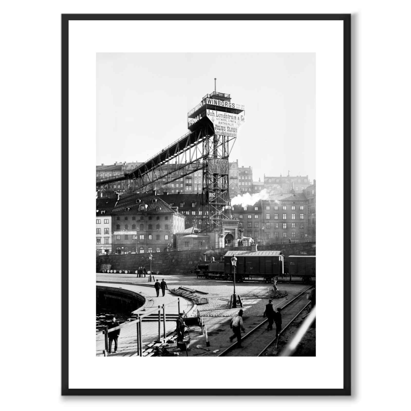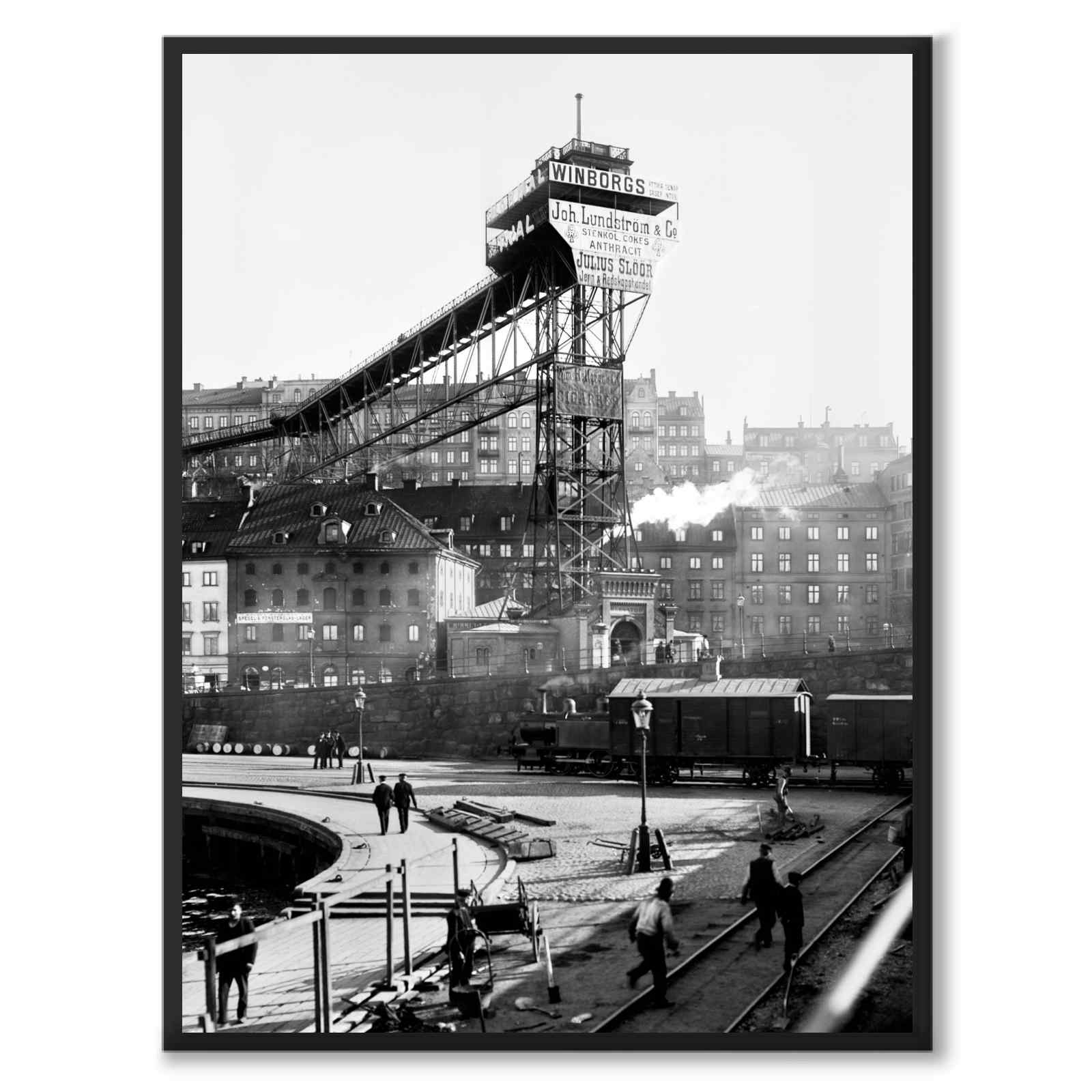 Katarinahissen sedd från Slussen någon gång mellan 1895-1900. Katarinahissen är inte bara en offentlig hiss utan även Stockholms mest kända hiss. Hissen och dess gångbro mellan Stadsgården och Mosebacke byggdes av ingenjör Knut Lindmark för att göra det enklare för människor att ta sig fram. Hissen invigdes år 1883. Det kostade 5 öre för uppfärd med hissen och 3 öre för nedfärd. Se vår andra bild av Katarinahissen från en annan vinkel och i liggande format här