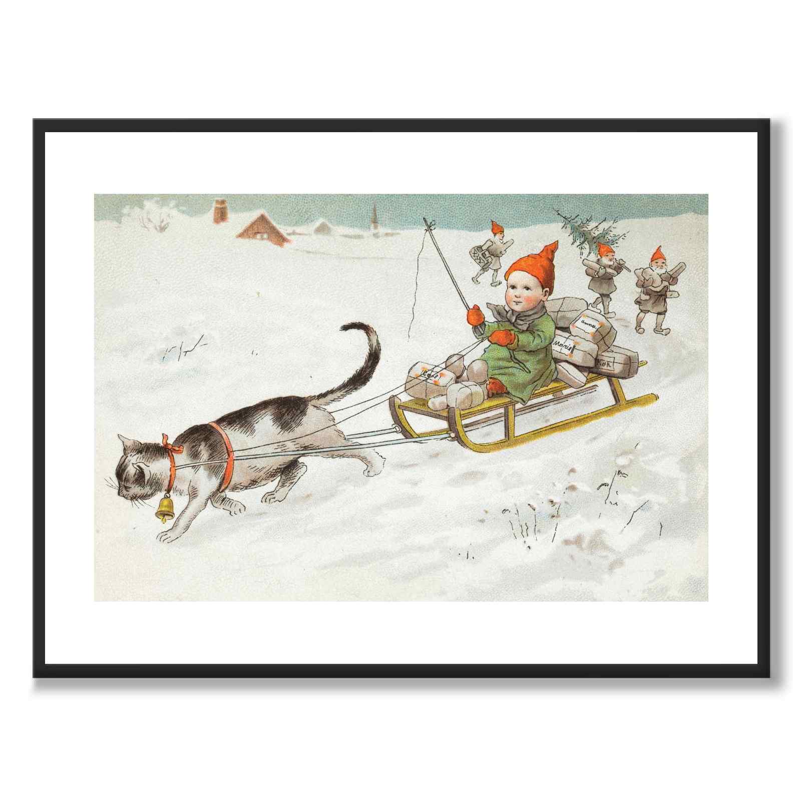 Poster med ett klassiskt julmotiv av Jenny Nyström från 1890. Ett litet barn åker en släde som dras av en katt i ett vinterlandskap. I bakgrunden ser vi tomtar som bär på julklappar.