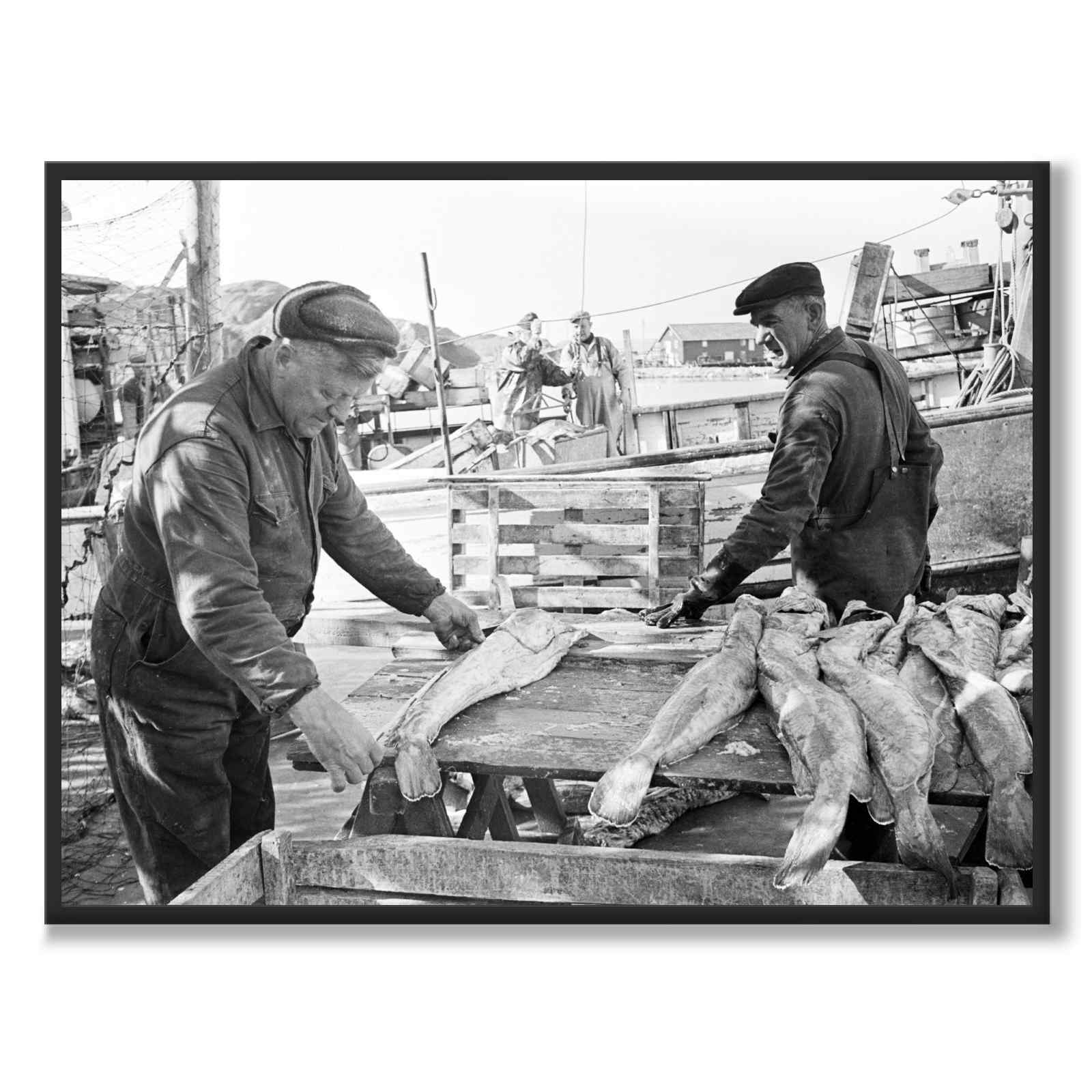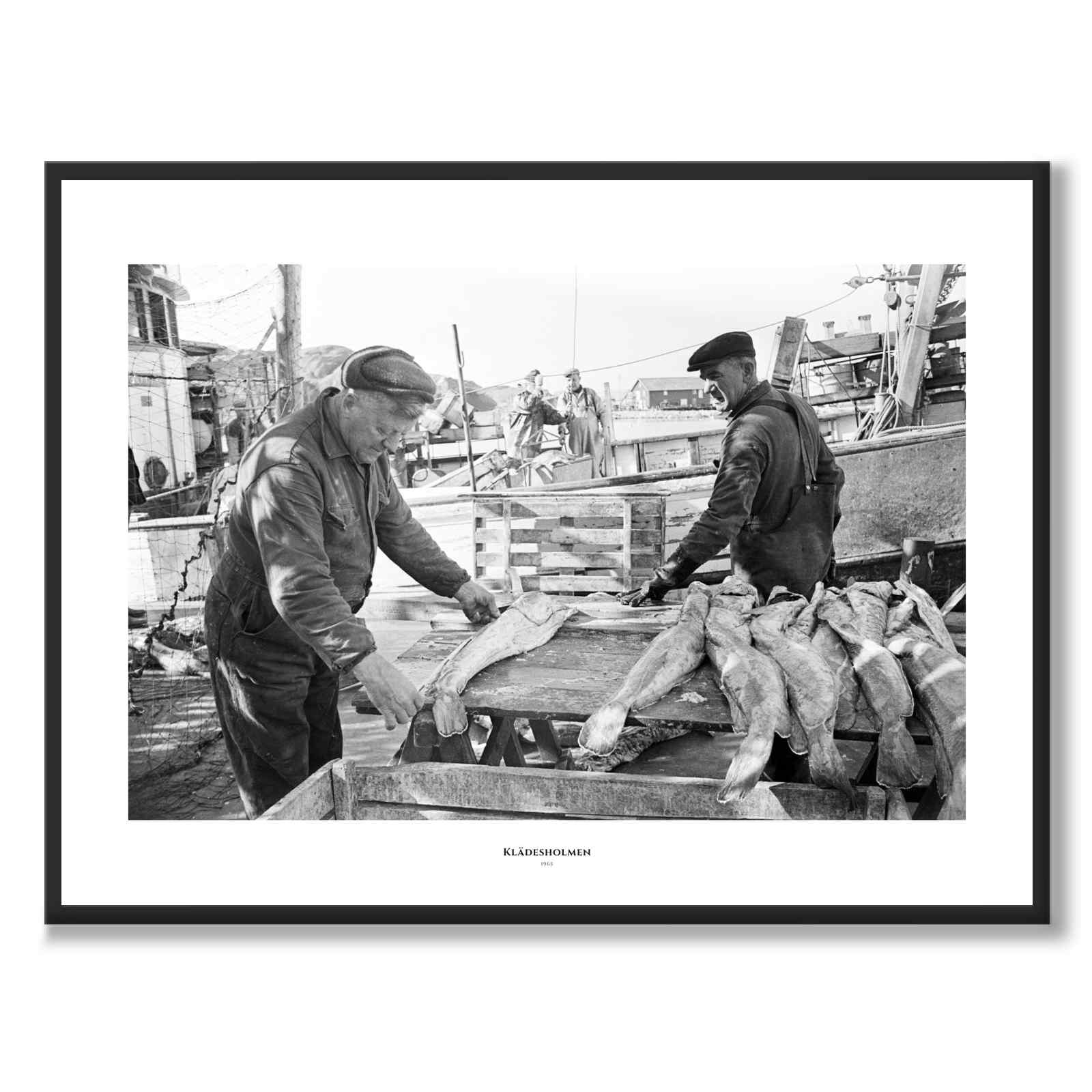 Poster med ett fotografi av Klädesholmen från år 1965. Det härliga fotot är taget av Terje Fredh. På fotot ser vi fiskare som hanterar fångsten.