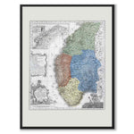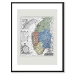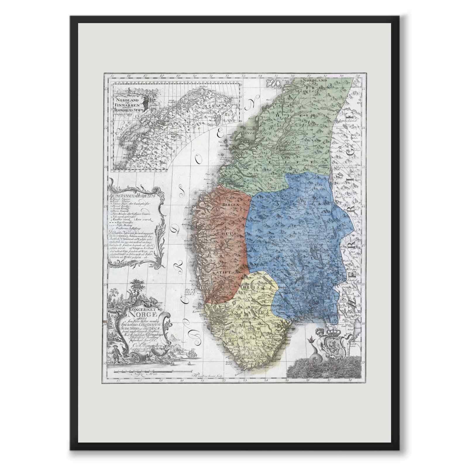 Poster med en gammal karta över Norge som är utgiven i Hamburg år 1761, med Ove Andreas Wangensteen som kartograf och Thomas Albrecht Pingeling som gravör. I