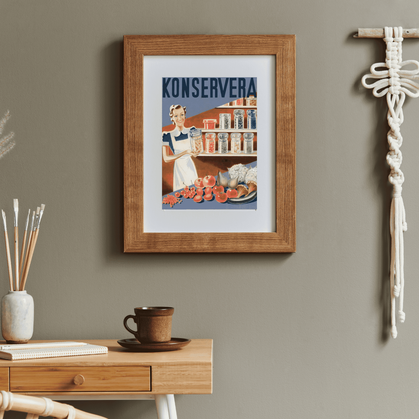 En vacker färgillustration visar Konsum Kooperativas, idag Coops, instruktioner för att konservera frukt och bär. En typisk husmor från 1940-talet står stolt med en glasburk fylld med konserverat innehåll. På bordet framför henne syns en mångfald av grönsaker, bär, frukt och svamp, medan hyllorna bakom henne visar färdigkonserverade produkter.