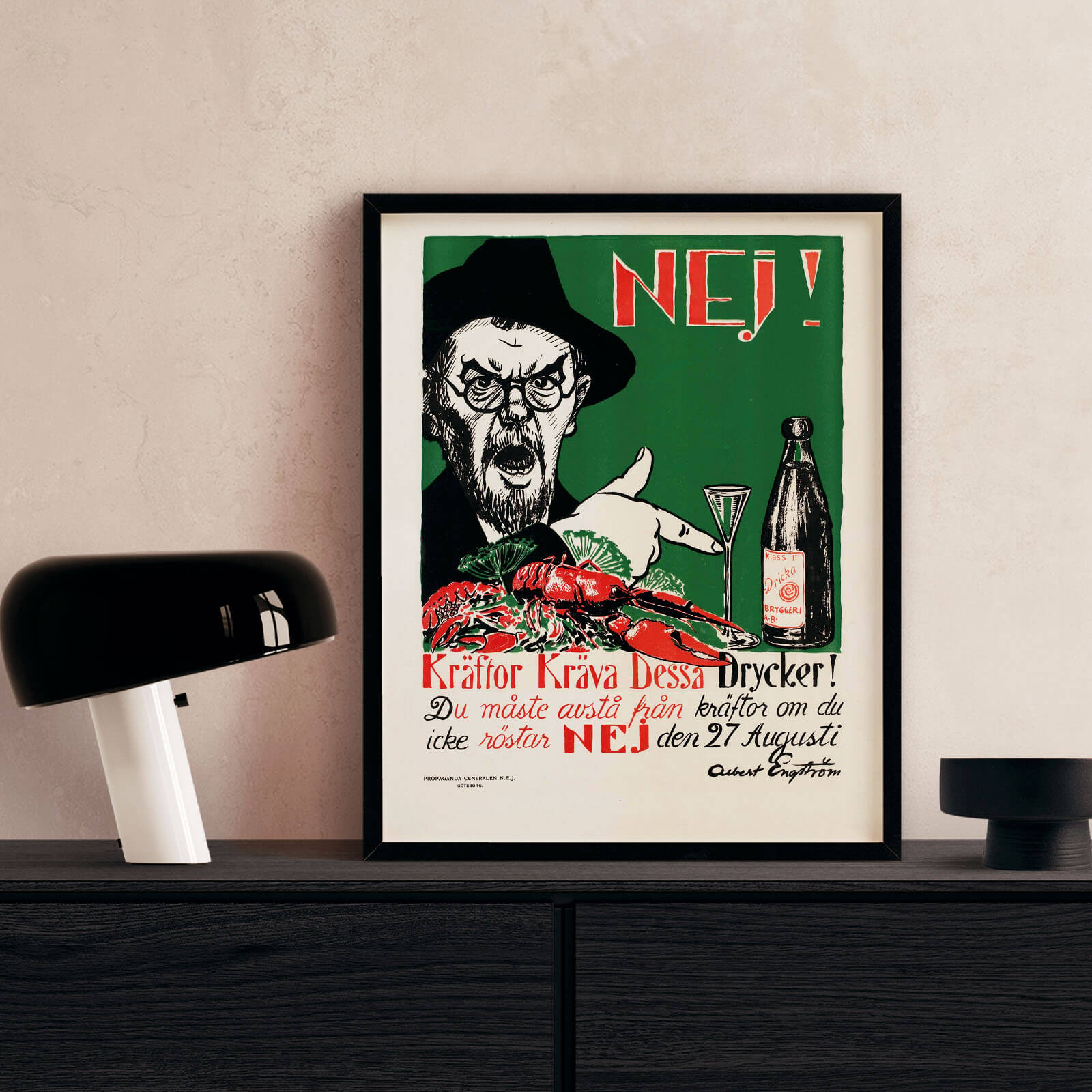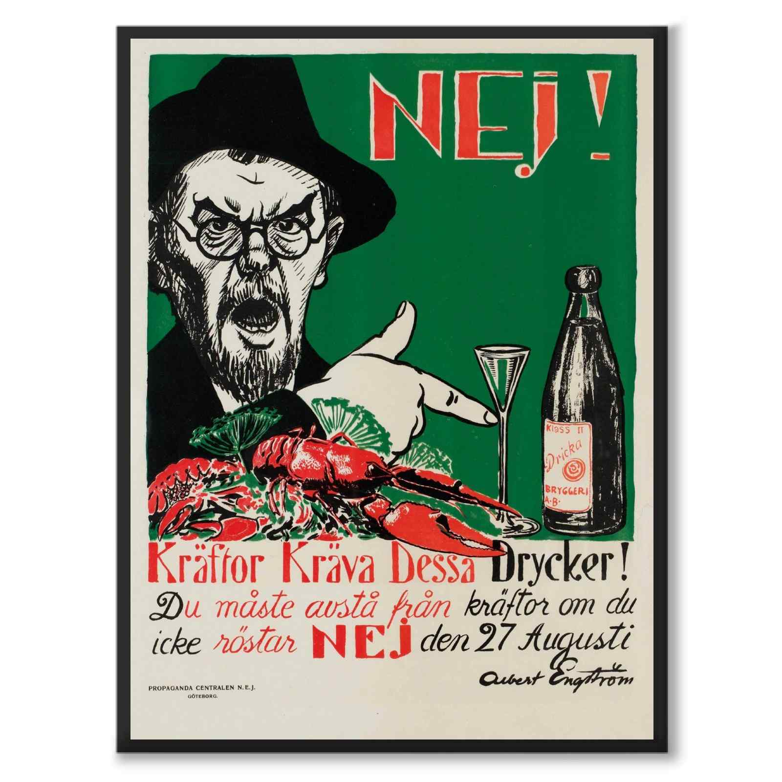 Poster med Kräftor Kräva Dessa Drycker!, nej-sidans mest kända valaffisch i samband med folkomröstningen för alkoholförbud i Sverige. Illustrationen skapades av Albert Engström år 1922.