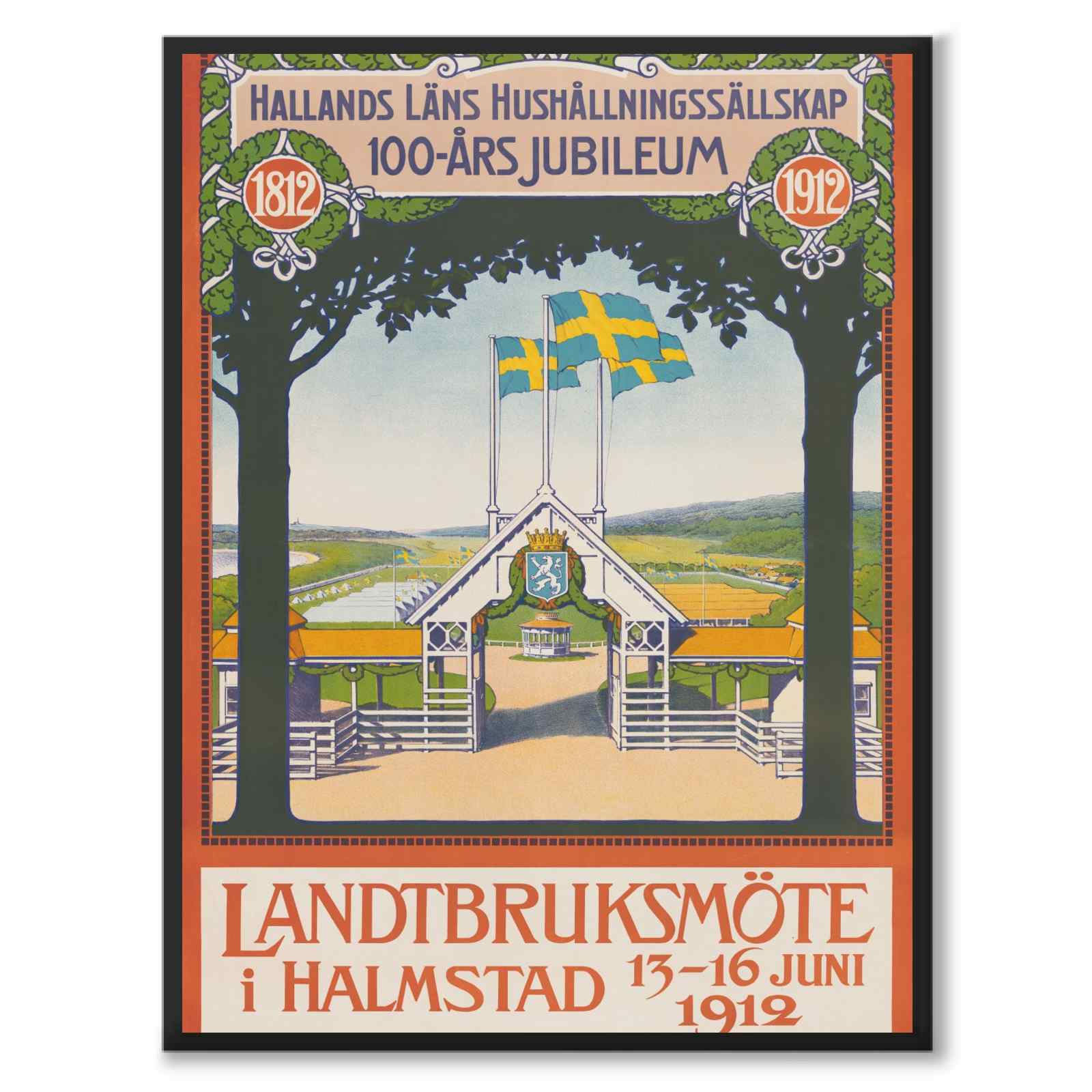 Poster med en fint illustrerad affisch om Lantbruksmöte i Halmstad. Mötet ägde rum 13-16 juni år 1912.