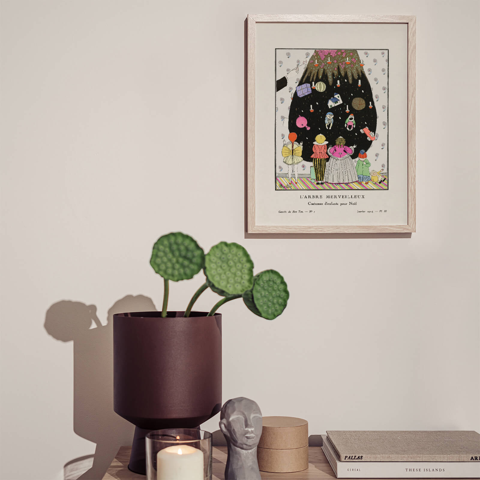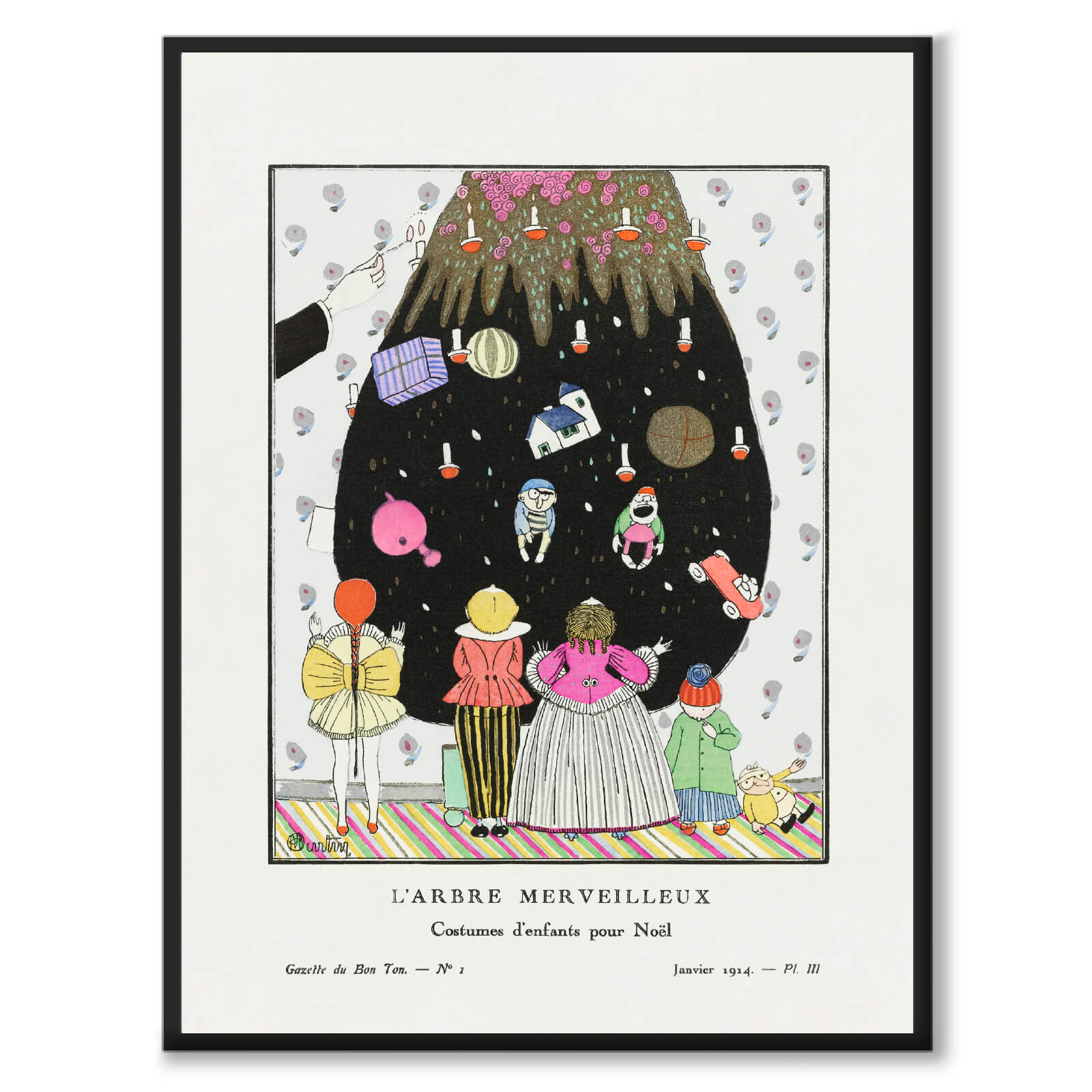 Poster med en modeillustration av Charles Martin från 1914. På illustrationen ser du texten L'Arbre Merveilleux - Costumes d'enfants pour Noël- franska för Det underbara trädet - barnkläder för jul. Motivet visar barn som betraktar en magisk julgran. Det hänger flera, olika leksaker i julgranen och barnen är klädda i vackra festkläder.