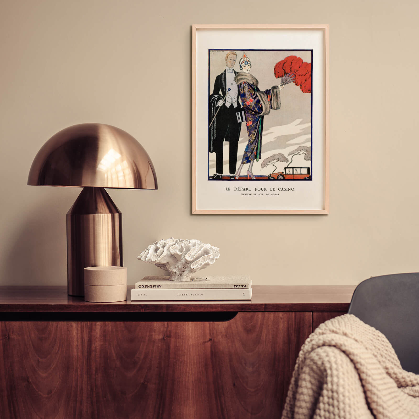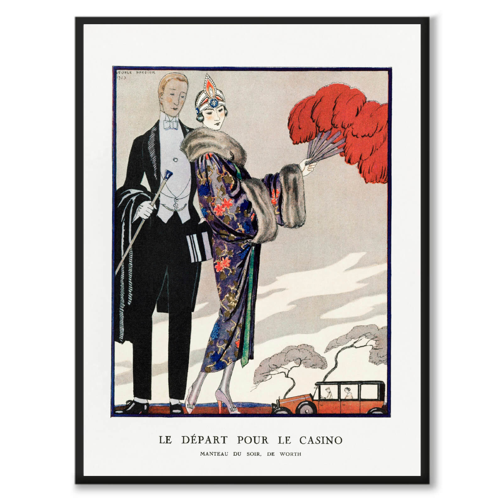 Poster med en illustration från ett franskt modemagasin år 1923. På illustrationen ser du texten Le départ pour le casino, Manteau du soir, de Worth - franska för Avresan till kasinot, kvällskappa av Worth.