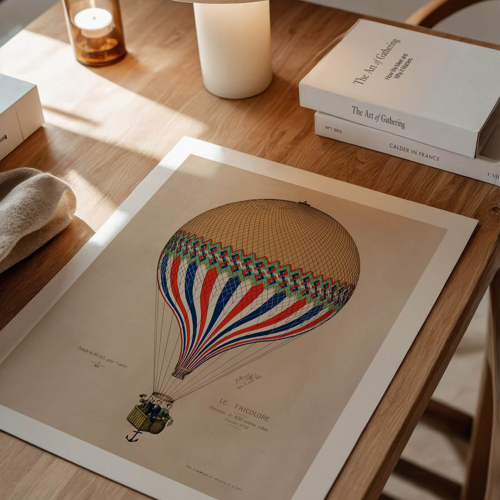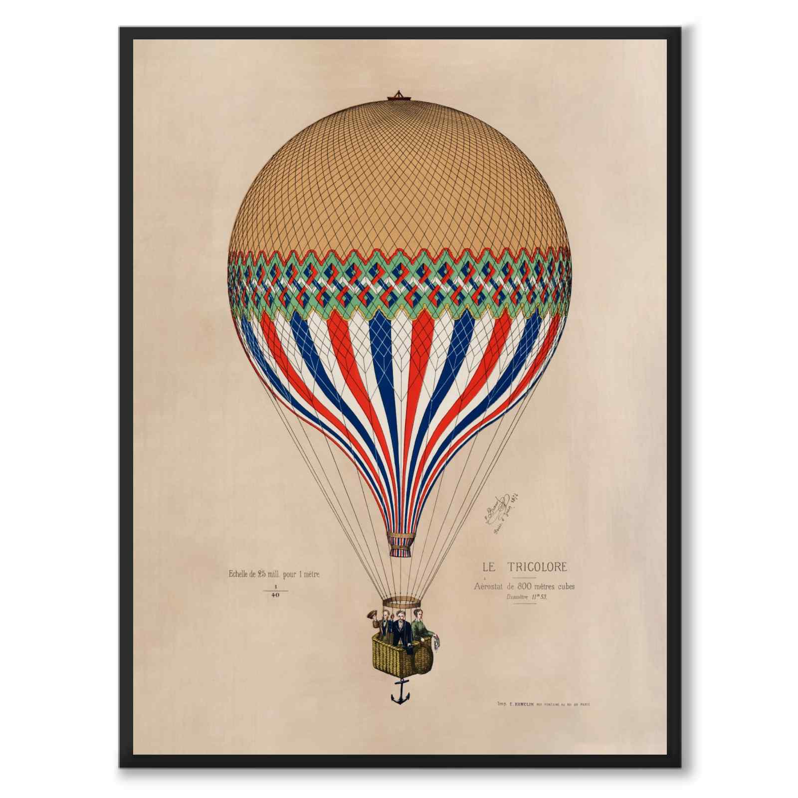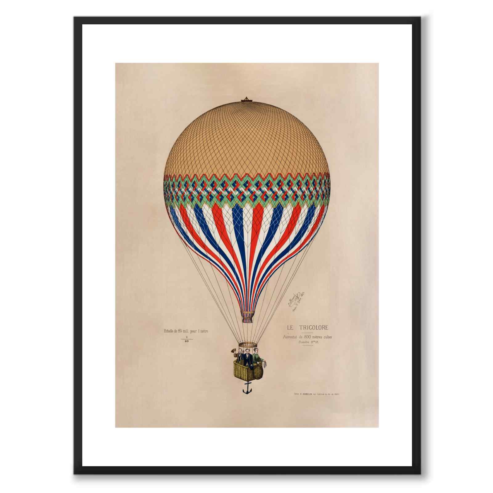 Poster med en gammal illustration av den franska luftballongen Le Tricolore.