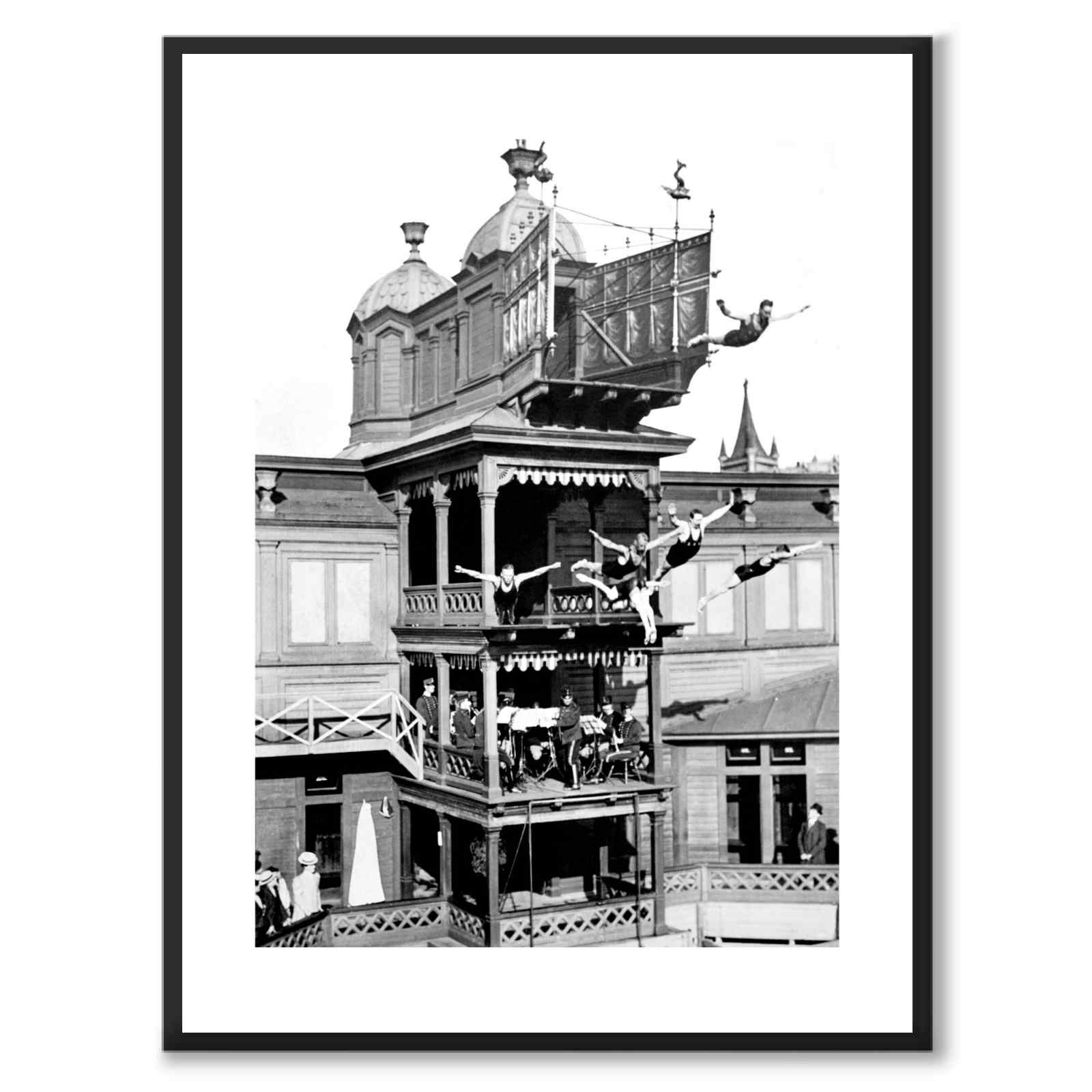 Strömbadet var det första kallbadhuset i Stockholm och låg på vattnet framför Stadshuset. Det var en vacker byggnad, byggd i renässansstil och skulle verka för stockholmarnas hälsa och simkunnighet. Skolbarn, poliser och brandmän hade fritt inträde, för övriga besökare var inträdet 35 öre. Strömbadet hade en avdelning för kvinnor, en för unga killar och den största, västra bassängen för simkunniga män. Det är denna avdelning du ser på fotografiet. Strömbadet var en plats för flera stora simtävlingar. På bilden ser du en simhoppsvisning någon gång mellan år 1900-1910. Ett imponerande fotografi av Axel Malmström som visar män som simultant gör olika avancerade simhopp. En man hoppar med ryggen mot oss: ett avancerat hopp som verkar vara i pik. På bilden ser du också en en orkester som spelar på andra planet.