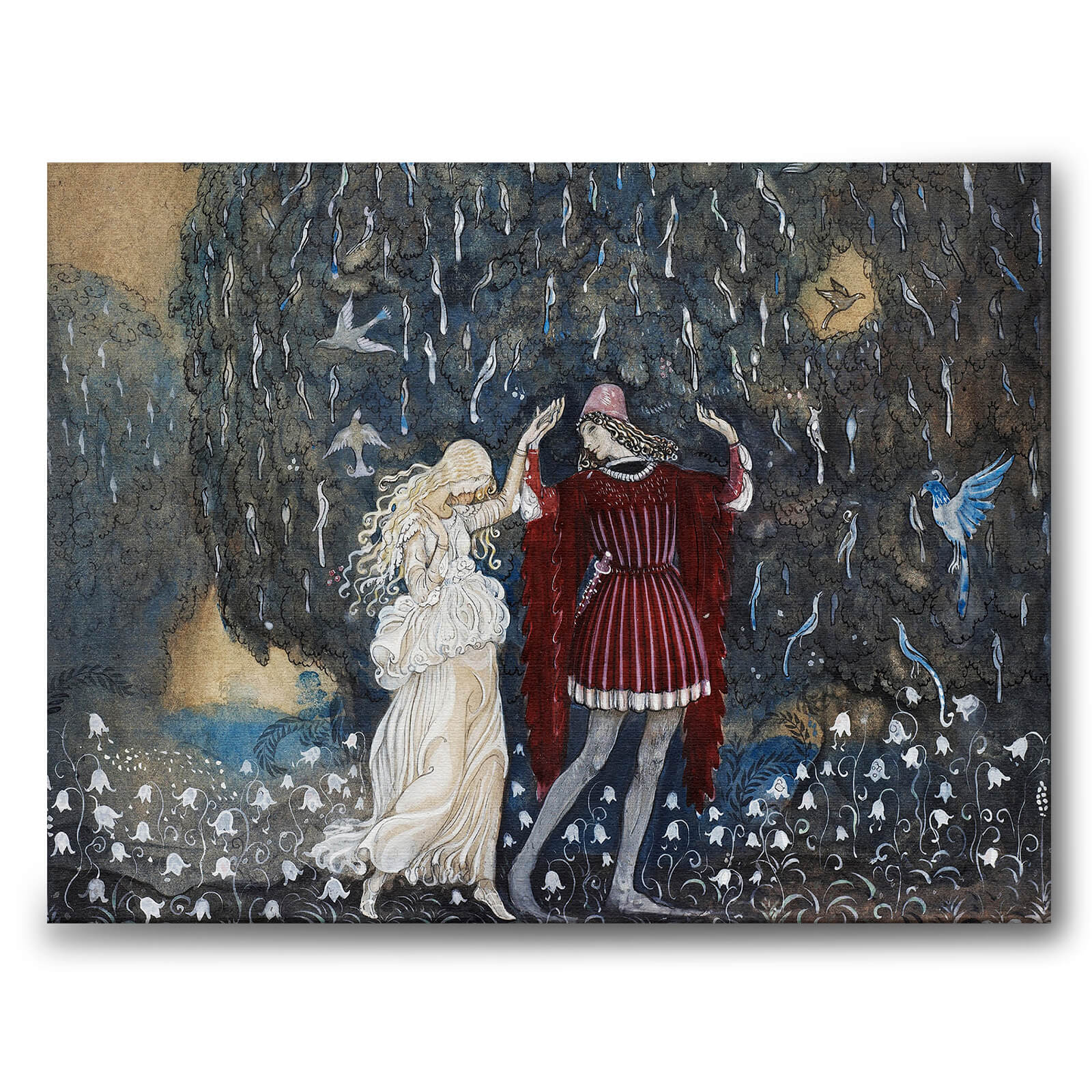 Canvastavla med målningen Lena och Riddaren Dansa av John Bauer från 1915. Bilden var en illustration till W.E. Björks saga Guldnycklarna i sagosamlingen Bland tomtar och troll.
