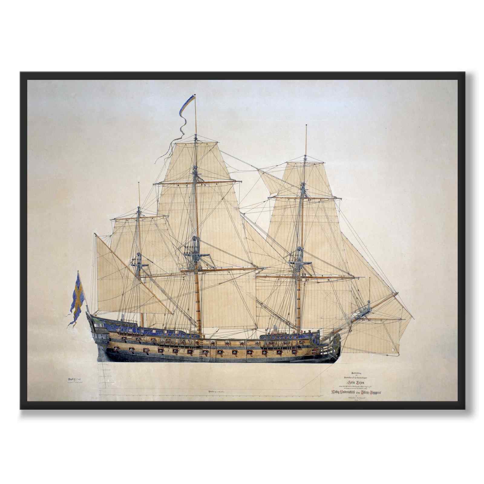 Målningen gjordes omkring 1880-talet och är en tuschteckning som föreställer 74-kanonskeppet Göta Lejon. Skeppet konstruerades av Sheldon Gilbert och byggdes år 1746, vilket placerar motivet i den svenska örlogsflottans stormaktstid.