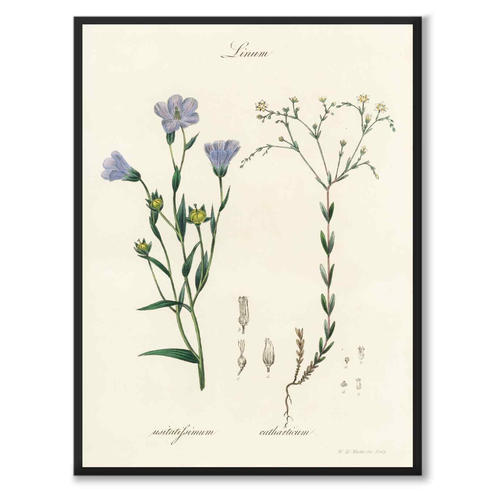Poster med en klassisk illustration av lin eller på latin linum. Linum är en växtsläkt inom familjen Linaceae, och är känt för sina användningsområden inom textilproduktion och kosttillskott. Dess fibrer används bland annat vid framställning av linväv/linne och oljan är rik på omega 3 och har antiinflammatoriska egenskaper.