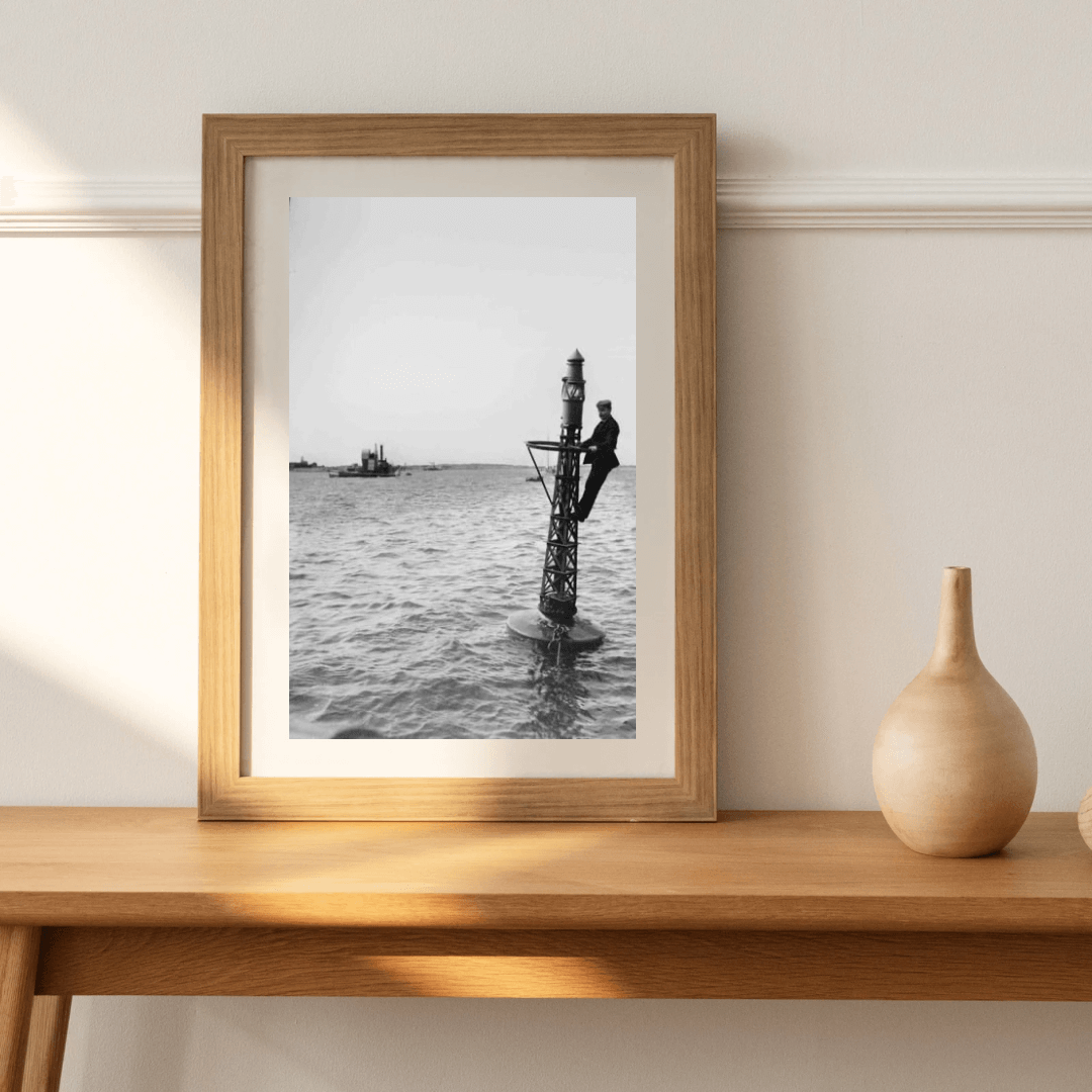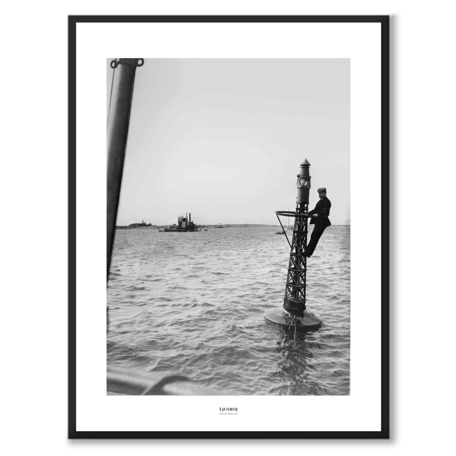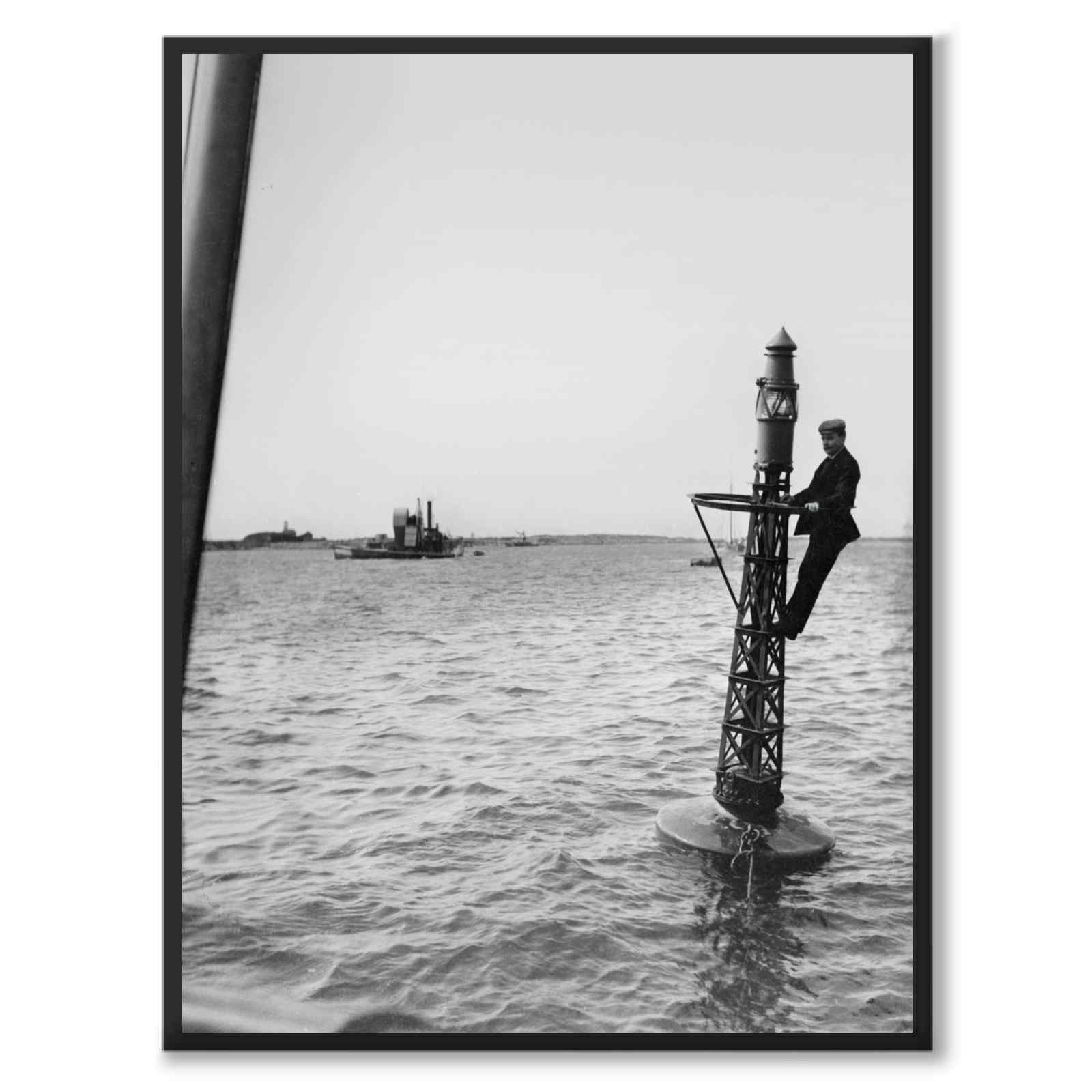Poster med motiv av en ljusboj vid Yttre Stengrund tidigt 1900-talet. En man iklädd kostym och basker står på ljusbojen och undersöker den.