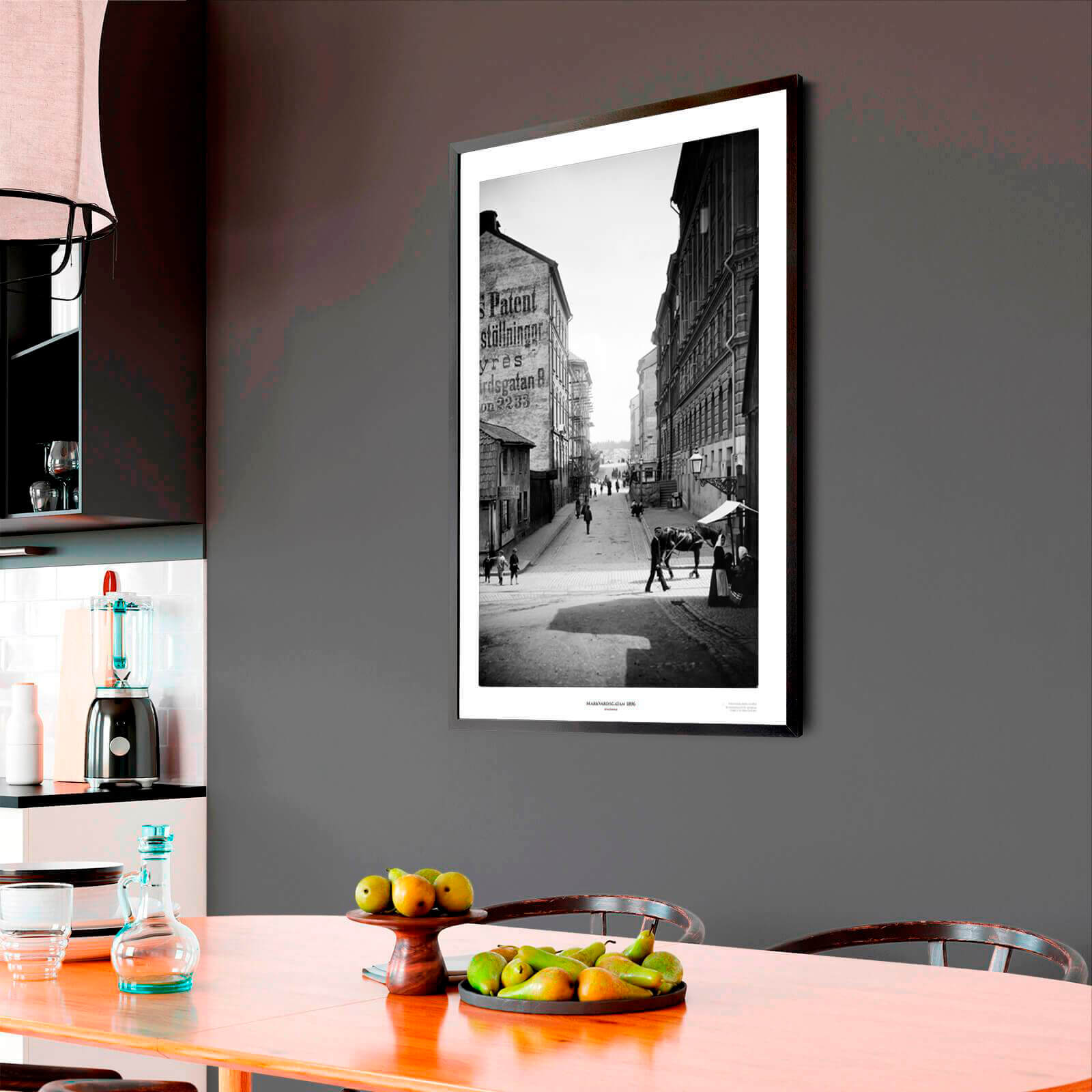 Markvardsgatan österut från Stora Badstugatan (nu Sveavägen) i Stockholm år 1896. Ett stenkast bort ligger skolor som Handelshögskolan och Norra Real och populära restauranger och caféer som Pom och Flora och Den Gamle och Havet idag.
