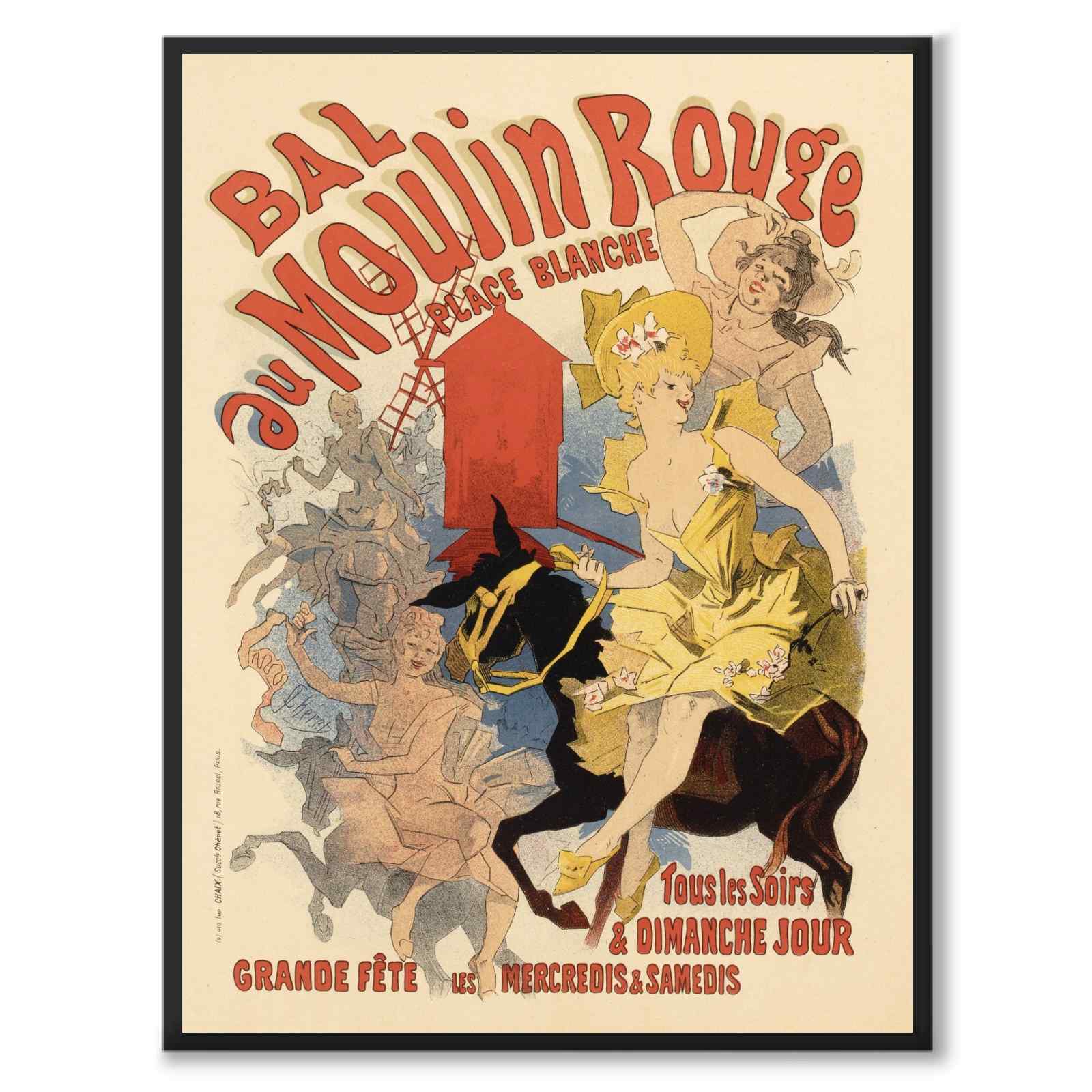 Denna affisch marknadsförde öppningen av det berömda cabaretet Moulin Rouge i Paris, beläget vid Place Blanche i Montmartre. Affischen visar en kvinna som rider på en åsna, omgiven av en virvel av dansande kvinnor i bakgrunden.