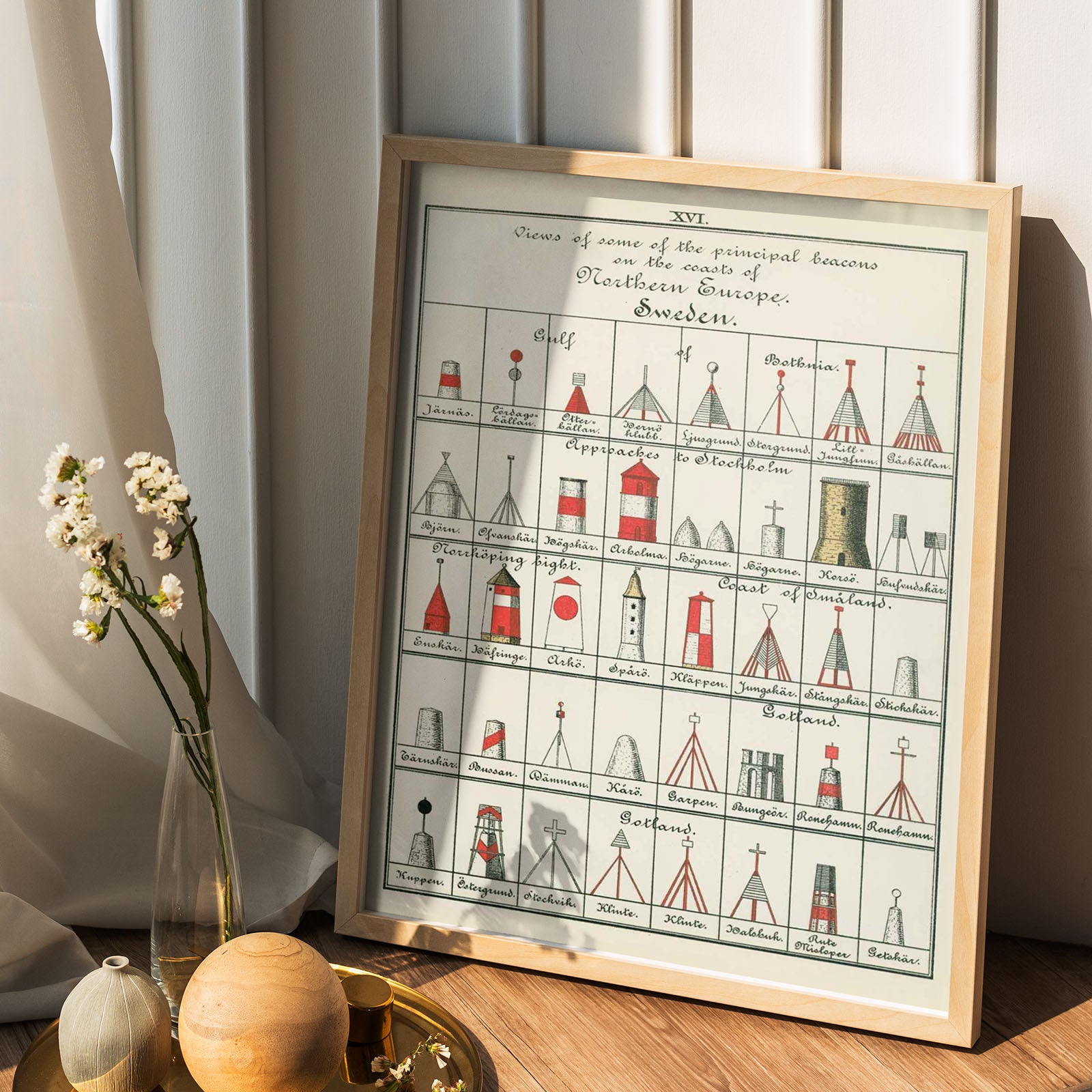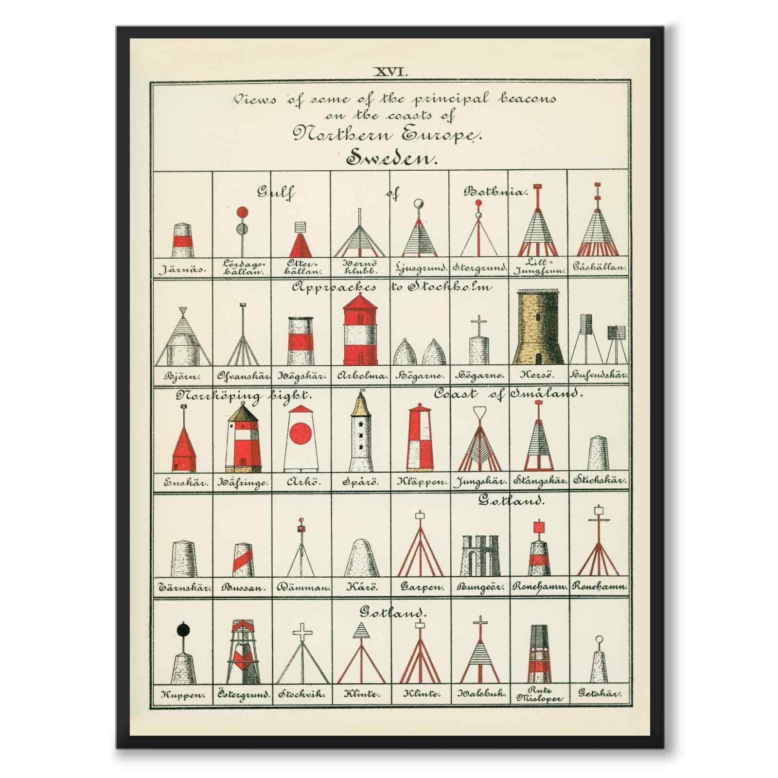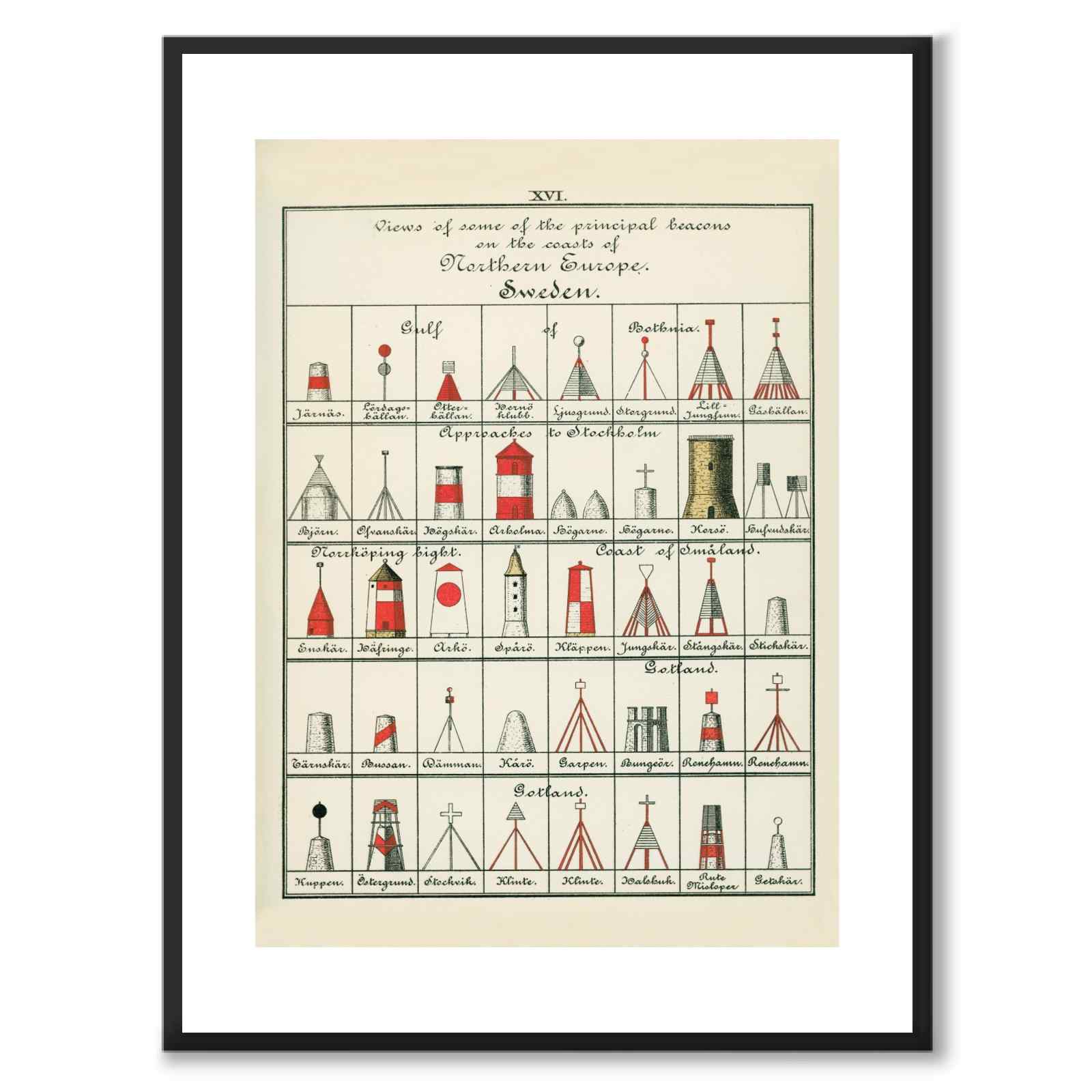 Bilden visar svenska fyrar vid Stockholm, Gotland, Småland och Norrköping – några står fortfarande kvar och kan beskådas i skärgården än idag, medan andra har försvunnit med tiden eller aldrig kom längre än till ritbordet.