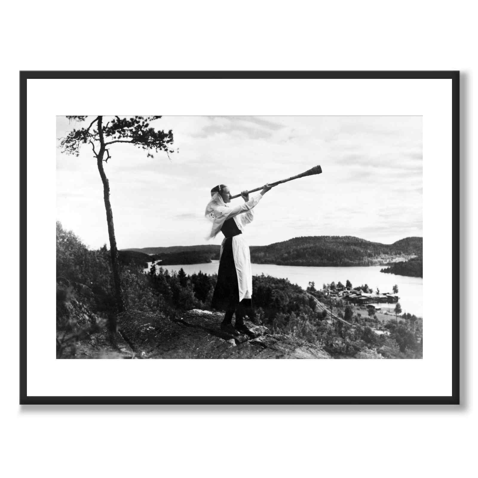Poster med ett vackert fotografi taget under 1930-talet. Det gamla fotot är av en kvinna som spelar näverlur. Kvinnan står på ett berg med en fantastisk omgivning av skog och vatten, nere vid vattnet går det även att skymta en by.