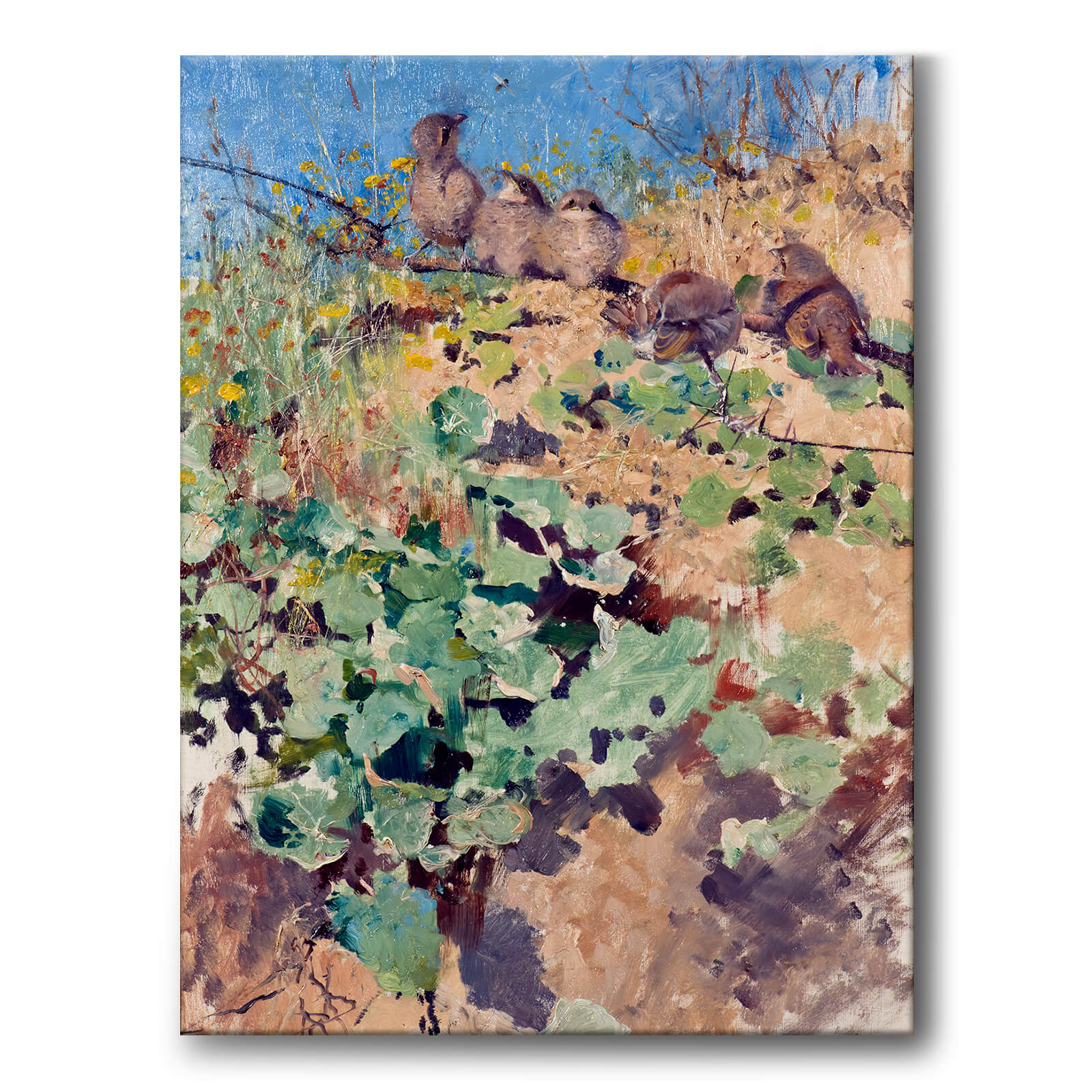 Canvastavla med målningen Törnskateungar av Bruno Liljefors från 1887 (engelsk titel: Nestlings of Red-Backed Shrike). En vacker naturbild med flera små törnskator som sitter på en gren vid vattnet.