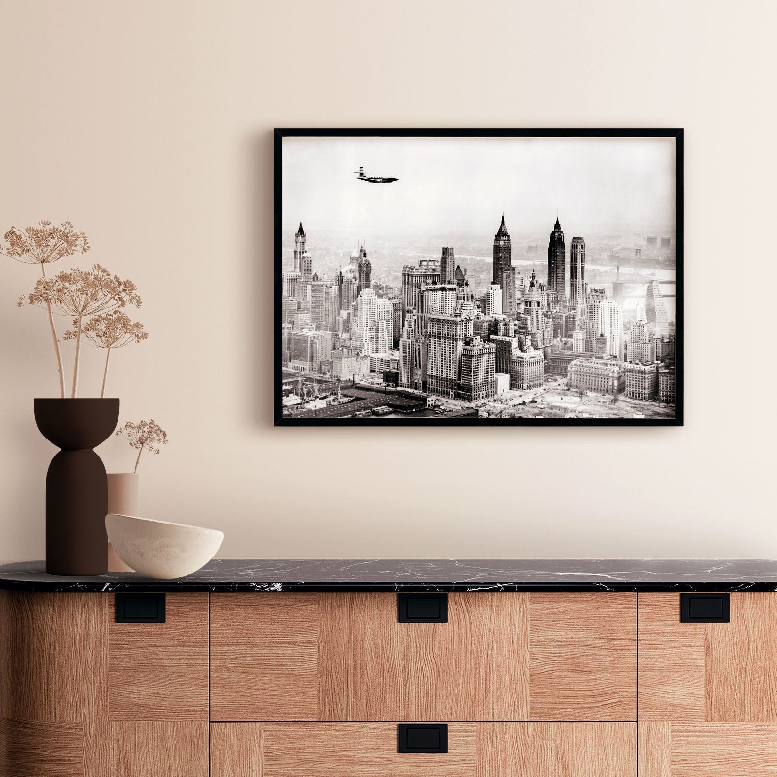 Poster med ett unikt foto från 1950 som visar New Yorks Skyline. På bilden syns ett flygplan samt ett antal ikoniska byggnader i den nedre delen av Manhattan. I förgrunden syns bland annat Battery Park.