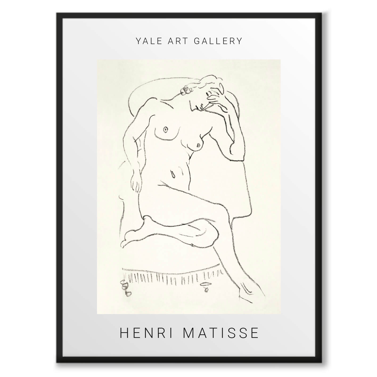 Poster med en vintage nude sketch av Henri Matisse. Motivet heter Nude sitting in a chair, one leg folded (1922) och visar en naken kvinna som poserar sensuellt. Originalet finns vid the the Yale University Art Gallery.