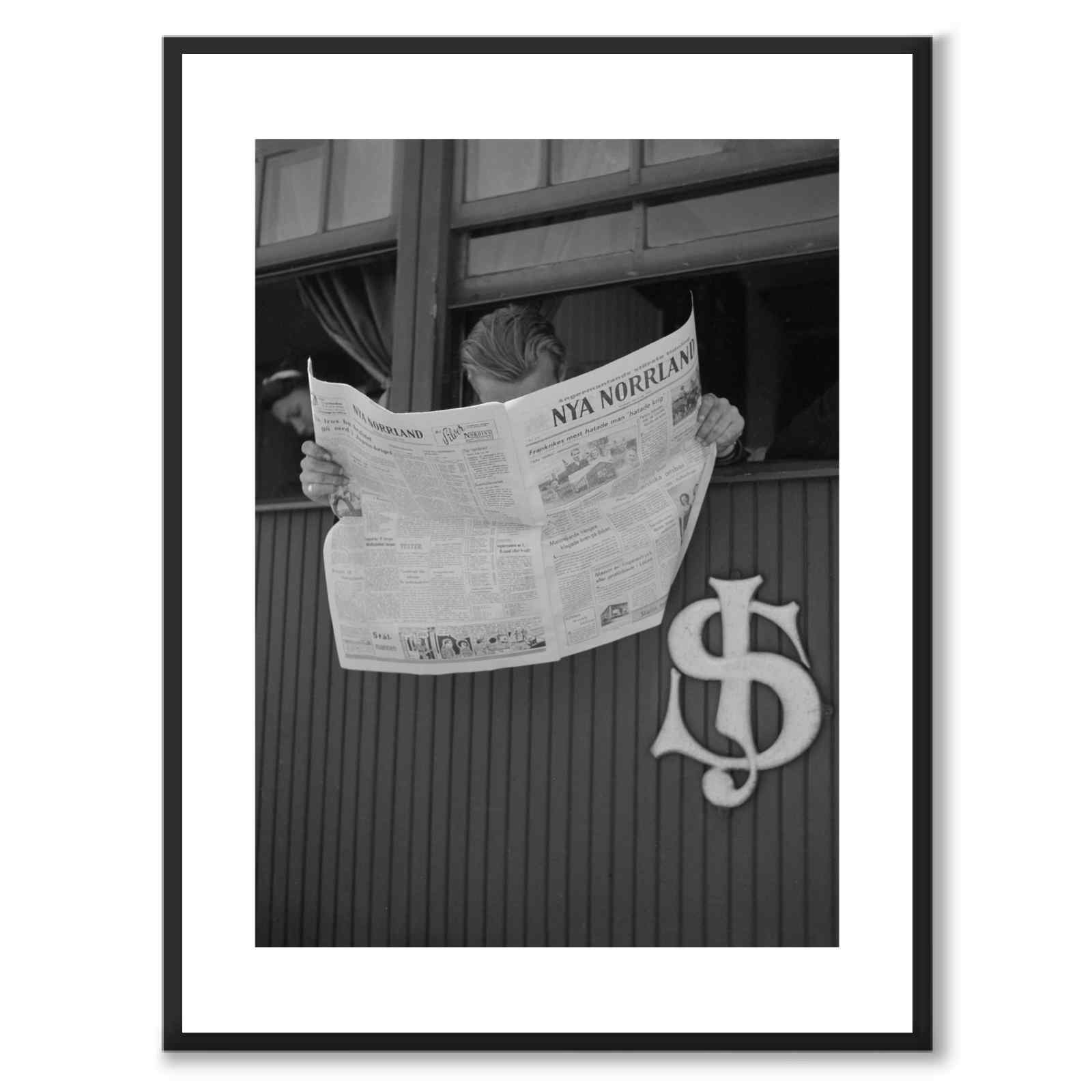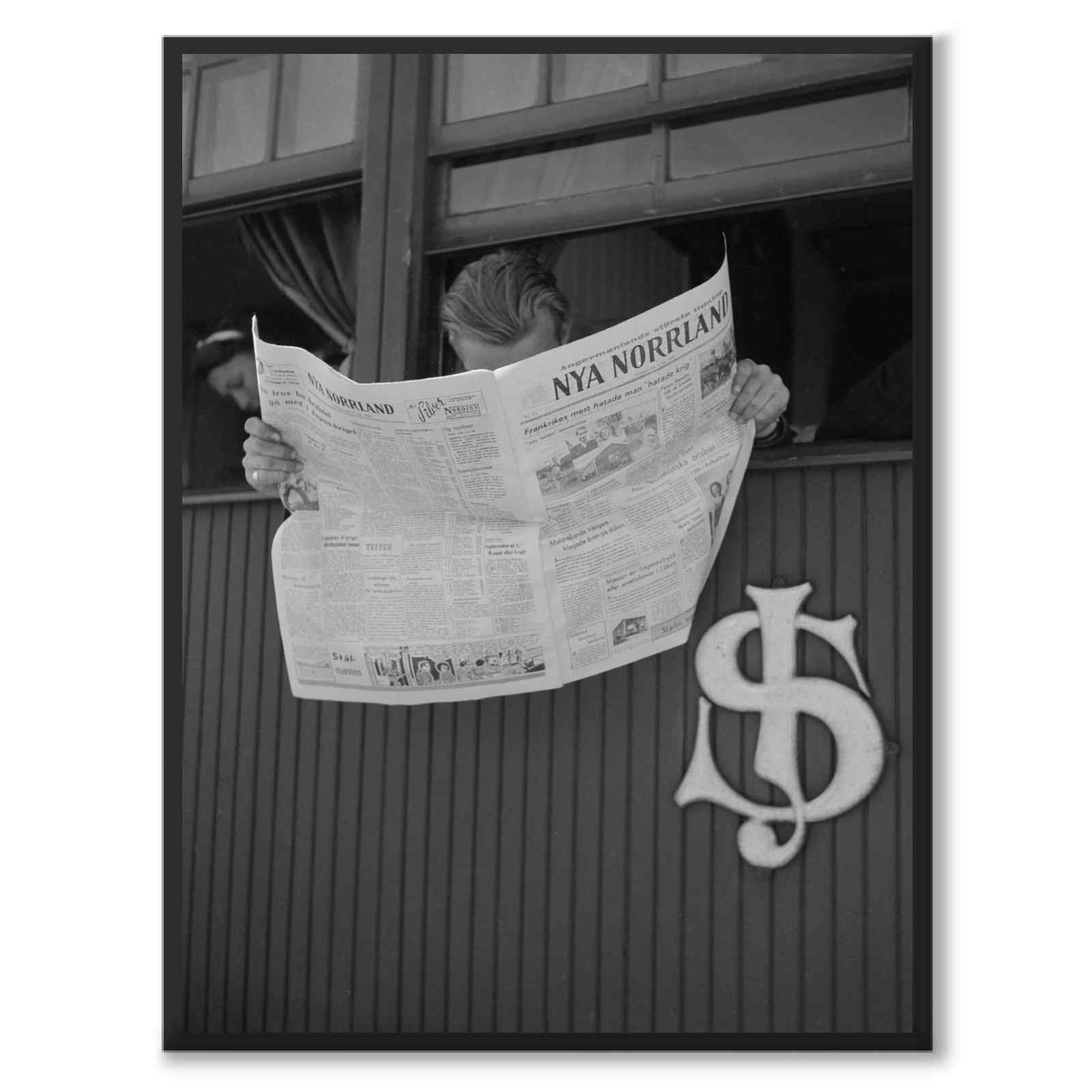 Poster med ett gammalt fotografi av en resenär som läser tidningen Nya Norrland år 1945. Mannen är ombord på ett persontåg med Statens Järnvägar, SJ, - vars första logotype vi ser på vagnen. Nya Norrland var en socialdemokratisk dagstidning som utgavs från 1907 till 1999.