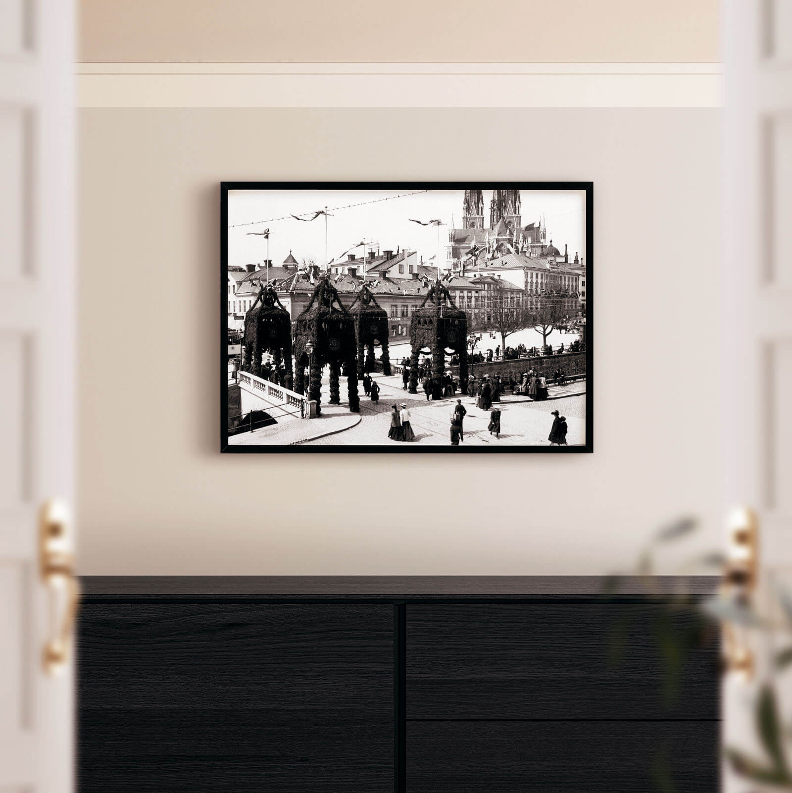 Poster med bild från 1907 på Nybron i Uppsala. På bilden syns Nybron som är dekorerad med pyloner som en del av Linnéjubileet, till höger Fyris Torg och i bakgrunden Uppsala Domkyrka. Fotografiet är taget från en byggnad i korsningen Östa Ågatan - Drottninggatan.